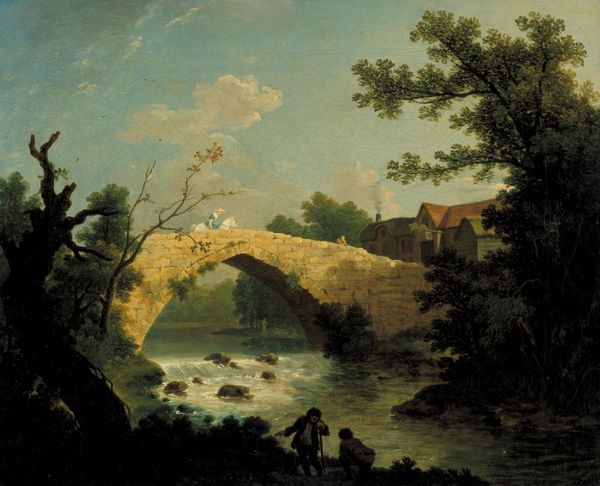 Editor: Here we have Hubert Robert’s "Fantastic View of Tivoli," painted in 1789 with oil on canvas. It’s striking how Robert blends this romantic, almost fantastical scene with ruins of classical architecture. What jumps out to you in this piece? Curator: Well, I see a reflection of the socio-political climate of the late 18th century. Note how Robert juxtaposes the idealized past—symbolized by the temple and Roman attire—with the figures struggling within the landscape. How does this tension speak to anxieties around the waning power of the aristocracy and the stirrings of revolution? Editor: That’s fascinating! I was focused on the aesthetics of it, the picturesque quality and dramatic lighting. I didn't immediately connect it to social commentary. Are you saying that these 'fantastic views' were a way of engaging with very real political concerns? Curator: Precisely. Consider the picturesque aesthetic as a carefully constructed ideology. It's not just about pretty scenes; it's about power, land ownership, and the romanticization of a past that never truly existed for most people. Who has access to this 'view', and what does that access signify? Editor: So the crumbling bridge and the lone worker...they aren’t just compositional elements; they’re suggesting instability and labor within this idealized landscape? Curator: Exactly! The decaying infrastructure hints at a society in disrepair. The laborer contrasts sharply with the leisured figures on the left. Robert is prompting us to question whose stories are being told and whose are being erased. Editor: Wow, I’m definitely seeing this with new eyes now! It makes me consider what's absent, whose stories are not immediately visible within that image. Curator: And how this single image, reflects complex themes of class, and privilege in 18th century France. Editor: I will remember this going forward and it offers ways to analyse art as commentary about what was happening in history and in culture. Thanks!
