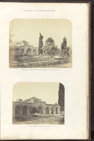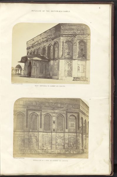 Art Historian: Editor: Editor: This albumen print, taken before 1865, gives us two views inside and outside the Dome of the Rock in Jerusalem. I'm really struck by how photography, still relatively new at the time, could capture the intricate details of these architectural spaces. What do you see in this piece? Art Historian: I'm immediately drawn to the materiality of this albumen print and how that shapes our understanding. Think about it: we're looking at a chemical process, light interacting with silver salts on paper. The final result speaks volumes about the colonial project's efforts of documentation. How was photography employed, distributed, and consumed in the mid-19th century, particularly in regions like Jerusalem? Who was seeing these images, and what purposes did they serve? Editor: That's fascinating. I hadn't considered the distribution of these prints. Were they intended as documents of power? Art Historian: Precisely. These weren't neutral depictions. This albumen print represents a specific, external gaze. The act of photographing a sacred space and then disseminating those images implies a certain control and ownership, influencing the viewer’s understanding and perspective of Islamic culture. Now, considering the intense labor and resources necessary to take and circulate photographs in this period, what does this say about wealth and power? Editor: Wow, that's changed how I see it completely. It's no longer just a pretty landscape; it’s about control, wealth and how images shape understanding. Art Historian: Exactly! By exploring the photographic medium, the work it took to create it, and the ways those prints were utilized, we gain valuable insights into a broader socio-political and economic context of that historical time. I learned a great deal about shifting my perspective of photographic image by contemplating its means of production.
