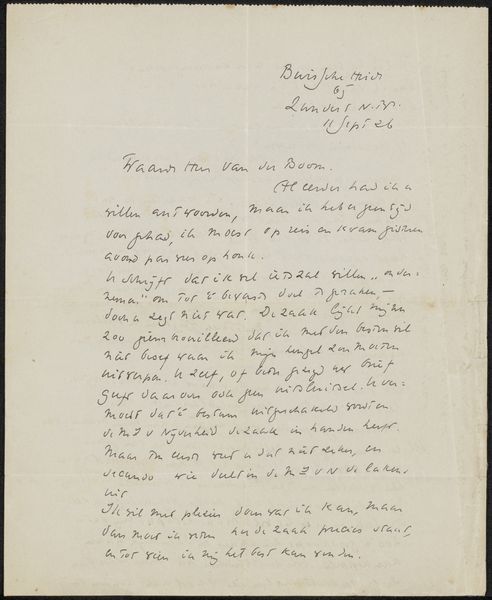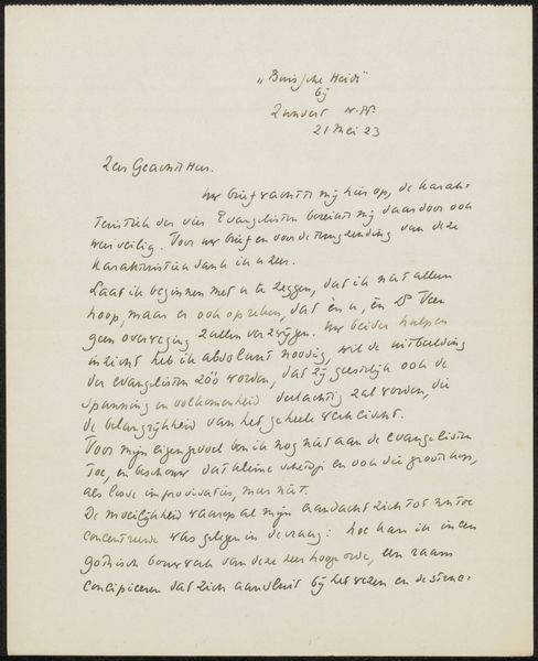 Curator: We’re looking at “Brief aan Ina van Eibergen Santhagens-Waller,” a drawing in ink on paper by Richard Nicolaüs Roland Holst, dating from roughly 1878 to 1938. Editor: It’s intensely personal, isn’t it? The handwriting gives it an intimate, immediate feel. Raw, even. Curator: Indeed. Roland Holst was a Dutch artist known for his socialist and spiritual beliefs, deeply ingrained in the cultural fabric of the Netherlands at the time. His involvement in political movements profoundly influenced his artistic output. Editor: So, the medium speaks to this. Ink and paper – materials of the everyday, accessible, portable. It suggests someone writing spontaneously, perhaps in transit or caught in a moment. The act of creation seems tied to a daily ritual, the material choices reflecting function over form, very workmanlike. Curator: The letter form also implies a social connection. Ina van Eibergen Santhagens-Waller, the recipient, would presumably have understood Holst's context. We see that the piece has cultural value given its current location at the Rijksmuseum, which underscores the interplay between personal expression and the historical narrative. Editor: Right. You can see him using the materials in an improvisational manner, capturing immediate thoughts. I would expect the historical context to reflect the conditions under which artists and intellectuals found common ground. Curator: Exactly, these visual and material traces can give voice to the daily exchange between the public and the intellectual class. The letter provides us with insight into the way knowledge workers interact with both materials and with social discourse. Editor: It's remarkable how a simple letter on paper can reveal so much about an artist's creative and intellectual environment. Curator: It truly encapsulates how a personal artifact can become a significant historical object, revealing social connections, beliefs, and creative approaches.