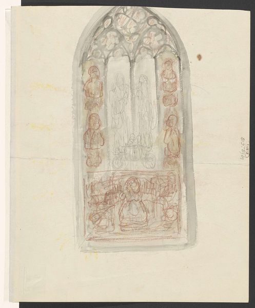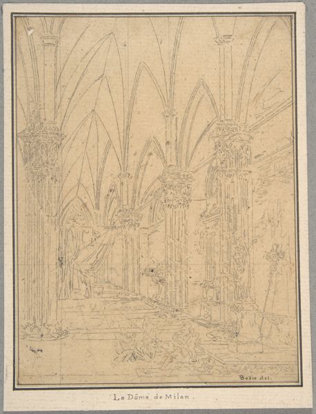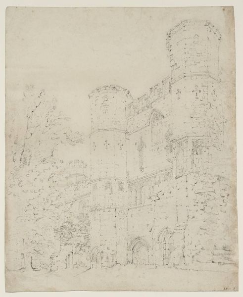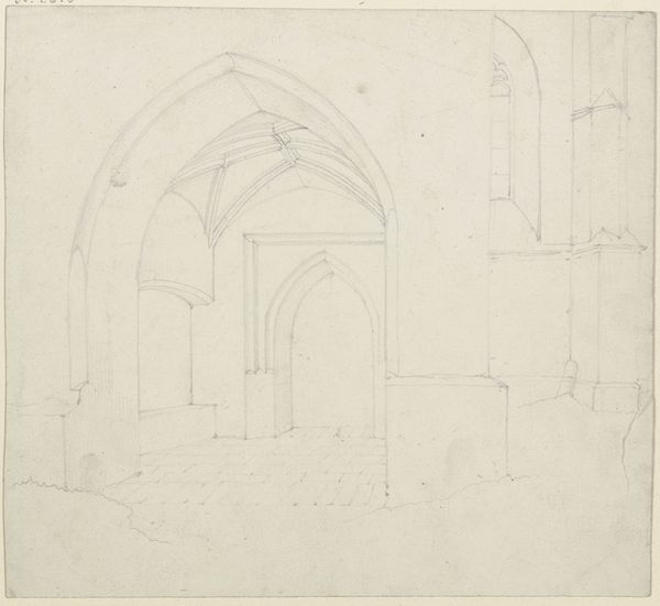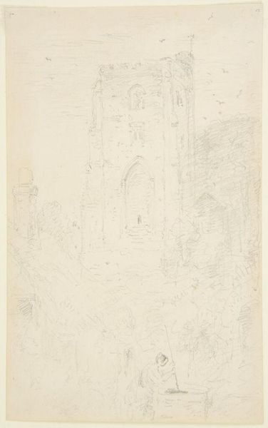Curator: Here we have Thomas Girtin's "Part of the Ruins of Walsingham Priory," from the Tate Collections. Editor: It’s ethereal. A skeletal monument rendered with such delicate lines… it almost feels like a memory fading. Curator: Indeed. Girtin’s light touch invites contemplation on the priory's history—once a site of pilgrimage, now reduced to this. The archway symbolizes a threshold, a transition from past glory to present decay. Editor: Notice how the verticality of the architecture is emphasized. It guides the eye upward, mirroring the aspiration, the longing for transcendence that these spaces once embodied. Curator: Precisely. And the faintness… it speaks to the fragility of faith, the impermanence of even the most monumental structures. Editor: Seeing it this way, I appreciate Girtin’s ability to evoke such profound emotions with such minimal means. Curator: A potent reminder that even in ruins, echoes of the past resonate deeply.