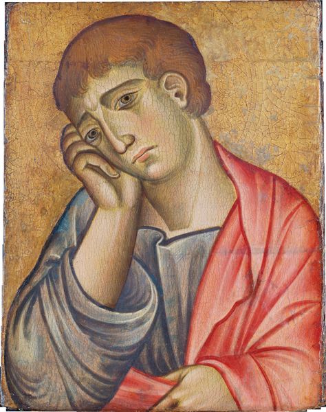 Curator: The gaze is certainly the first thing that strikes you, wouldn’t you agree? Editor: Absolutely, that upturned, visionary expression is really quite affecting. There’s an almost desperate yearning there. Curator: We’re looking at Carlo Crivelli’s “An Apostle,” likely created between 1468 and 1476. The artist chose tempera and oil, resulting in what strikes me as a stunning level of detail on panel. You really feel you could step right back into fifteenth-century Italy, no? Editor: Italy, yes, but let's not forget the specific cultural and socio-political context in which Crivelli was working. He was very much part of a conservative movement that, while embracing some Renaissance innovations, largely upheld a rather Gothic aesthetic. The figure almost seems to push against the decorative. Curator: The use of gold leaf definitely places it in a tradition of reverence, harking back to Byzantine iconography. This reflects something of what I perceive as continuity… it speaks to me of ancient ways of knowing. Note the specific details – his halo, and the script itself which reminds me of those times, calling to mind those long gone sacred spaces. Editor: Agreed, but this adherence to a perceived “divine order” also serves to reinforce existing social hierarchies. Consider who has access to the divine knowledge held within the text, and who is denied that access. Crivelli's works, however devotional, were often commissioned by elites, effectively performing power structures in paint. Curator: His raised finger… a symbol for the transmission of divine truth, pointing upwards, to where sacred wisdom dwells, or from whence it flows? Editor: Or pointing toward a future…or to power...one where his ideas become reality… In this setting we are not necessarily talking of divine right but…divine mandate…I am unsure, though, of how much “reality” factored into it... Curator: Even across centuries, this piece clearly sparks diverse ideas and convictions. I do like art with enduring influence! Editor: Indeed. I am taking so many social issues of this piece and its meaning. It seems so open to interpretations depending on where you come from in life. It’s quite fascinating.