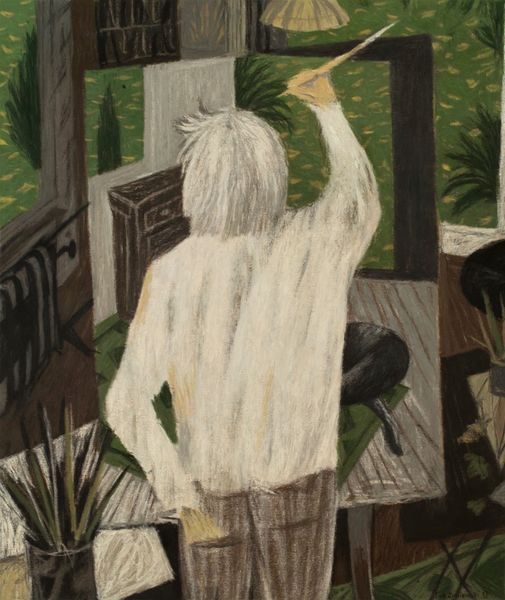 Iwo Zaniewski created this drawing called ‘Summer in the Studio’ with pastels, but when, and where? In this intimate scene, the artist is depicted from behind, casually dressed, reaching out with a brush towards a vibrant, sunlit landscape. The open window frames a lush, green world, a stark contrast to the enclosed studio space. The composition suggests a dialogue between the interior world of artistic creation and the exterior world of nature. Consider the shift from Soviet control in Poland, where Zaniewski was raised, to the increasingly globalized art world of today. The setting, a studio, is a critical detail. Artists require both financial support and creative independence, and there is a long history of tension between the state, the market, and the individual artist, particularly in the formerly communist countries of Eastern Europe. To better understand Zaniewski's work, we might research the changing dynamics between Polish artists and the institutions that support their work, as well as the relationship between the artist, the studio, and the natural landscape.