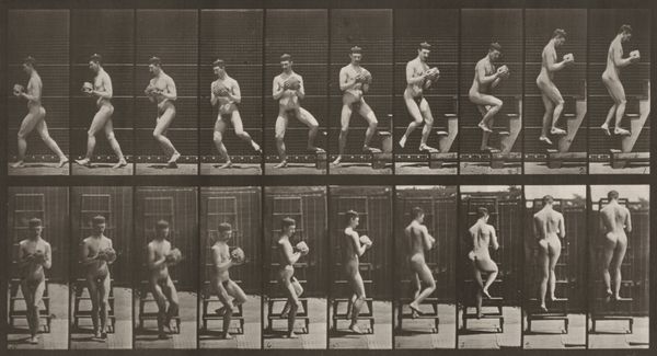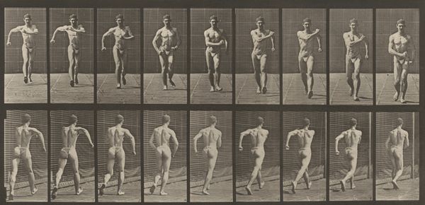 Editor: This gelatin silver print from 1887 is titled "Plate Number 66. Running" by Eadweard Muybridge. It feels incredibly scientific, almost like a biological study laid out in a grid. What kind of narratives do you think Muybridge was trying to create with this kind of photographic study? Curator: Muybridge's work vibrates with layers of meaning. Notice how he dissects movement itself, a primal human act. The grid format and stark presentation certainly lend a scientific air. Yet, consider what the image _withholds_: the runner's context, his motivation, even his identity beyond the physical form. Does the anonymity amplify or diminish our perception of the figure in motion? Editor: That's interesting; it’s almost as if we're meant to focus on the mechanics of the run, stripping away anything personal. But isn't the act of running itself inherently personal, driven by emotion or necessity? Curator: Precisely. Muybridge captured a culturally specific tension. He froze motion with photography, creating a tension between science and art, objective analysis, and subjective interpretation. This raises questions about the psychology of perception itself. The image isn't merely documentation; it reflects societal desires to understand and classify the human experience. Do you see a lasting power in these very early, but deeply profound attempts to break down aspects of the everyday? Editor: Absolutely. By showing the individual frames, the artwork shows that motion is never as straightforward as we experience it and encourages the viewer to stop and question it. Thanks for showing me how Muybridge has made us reflect on science and society. Curator: And thank you for recognizing how motion, documented this way, continues to reshape our understanding of movement today.