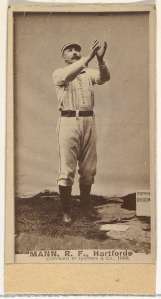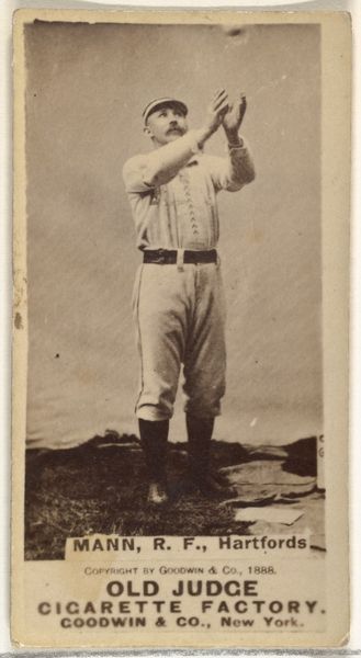 Curator: Ah, here we have an albumen print from 1888, a baseball card, really, from the "Old Judge" series. It features James Edward "Tip" O'Neill, a left fielder for the St. Louis Browns, printed by Goodwin & Company. Editor: Whoa, that's some serious vintage vibes right there! I love the sepia tone; it's got this dreamy, old-timey feel. And look at that 'stache! Majestic. It makes me think of summer afternoons and cracker jacks. Curator: The Old Judge series is fascinating, particularly when viewed through the lens of labor and consumer culture. Consider that these cards were inserted into cigarette packs. So we have an entanglement of sport, industry, and personal habit all vying for attention in late 19th-century America. It begs us to think about the intersections of masculinity, commerce, and celebrity. Editor: Totally. You’re hit with that capitalist paradox. They're selling us tobacco by dangling heroes... like baseball gods! Is he posed with the bat back, ready to swing at some historical oppression or just a curveball? I like to think the former, obviously. Curator: It's intriguing to analyze O'Neill’s positioning within this broader historical context. How did his athletic prowess, captured in this simple portrait, function as both a commercial tool and a cultural signifier during a period of intense industrial expansion and societal transformation? Editor: Exactly! It makes me think… What's his story? What pressures was he facing on and off the field? Was he in on the game or just playing it? You know? Still...I find so much to be discovered in that simple moment frozen forever! The composition centers us with our hopeful hero in motion...sort of an everyman! Curator: Indeed, analyzing art like this—even something seemingly simple like a baseball card—lets us peel back the layers of history, power dynamics, and social constructions of the time, hopefully helping us to see and change those power dynamics in the current moment. Editor: Right, let’s step up to the plate. Okay, alright. I think this calls for another glance. Makes you feel like the world's series might need a pinch of philosophical seasoning next year!