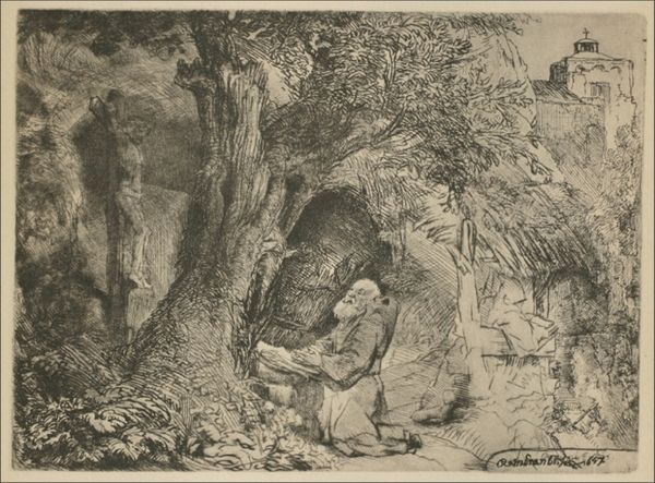 Curator: This is Jean-Jacques de Boissieu's "St. Jerome," an engraving dating back to 1797. What strikes you immediately? Editor: The starkness, even melancholy, really stands out. The fine lines capture Jerome’s aging body, perched outside what appears to be a humble, perhaps makeshift, abode. Curator: The landscape contributes so much to that atmosphere. We see how Boissieu used etching and drypoint techniques to vary the textures and line weights in the composition, drawing our eye from the dark foliage on the right to Jerome himself. Editor: I'm interested in how the setting itself underscores the themes of devotion and scholarly withdrawal. The stark landscape contrasts with the rich detail given to St. Jerome. There's a sense of internal retreat reflected in the external world, right? A rejection of worldly pleasures and the seeking of a raw existence devoted to translating and writing scripture? Curator: Yes, but Boissieu also presents Jerome engaged in an act of manual labor—he's actively working, holding what could be either a book or a stone tablet and carving it, with tools in hand. It merges intellectual pursuits with physical creation. The artistic labor is clearly highlighted. Editor: Absolutely. In considering his choices, I keep wondering about how much his portrayal of St. Jerome sought to critique or validate certain gendered positions within the Church at the time. The historical and religious weight certainly impacts our reading of it today. It cannot escape our interrogation! Curator: Right. Boissieu gives us both a landscape and a figure study here—it's an engraving but shares the sensibilities of history painting. There is a flattening that comes with reproduction, that the use of etching works towards preventing. Editor: Exactly, and acknowledging this work’s socio-political implications—considering how artistic patronage and institutions contributed to constructions of ideal masculinity and piety – invites a more critical viewing experience. Curator: Ultimately, what is impactful here is a depiction of devotion combined with tangible production that allows us insight into artistic practices in Boissieu’s era. Editor: It's the confluence of inner solitude and creative exertion presented with such delicate line work and composition choices that makes this St. Jerome compelling and ripe for contemporary dialogues.