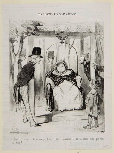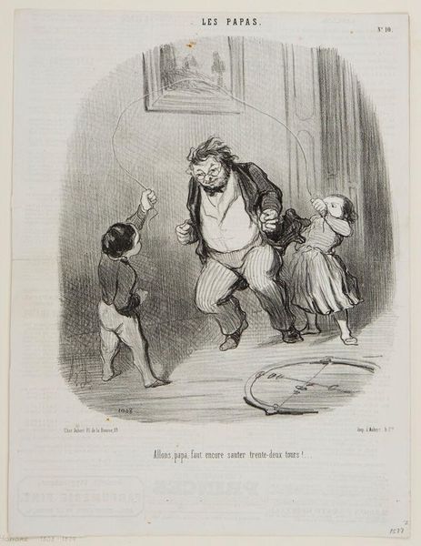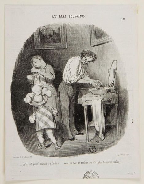 Curator: This lithograph, titled "Ah! You are my husband, ah! you are my master--" by Honoré Daumier, presents a rather charged domestic scene. Editor: It's stark. The frantic lines and dramatic contrast create an immediate sense of turmoil. What's going on here? Curator: Daumier made this piece to express his views on the then contemporary feminist movements, and more broadly to depict social dynamics within marriage. Editor: I see her hand at his throat, but what about the material conditions that lead to such strife? Is it about power dynamics, maybe the husband's clothing suggesting bourgeois aspirations clashing with the realities of domestic labor? Curator: Precisely. This image speaks volumes about the social expectations placed on women, especially within the context of 19th-century French society and the stirrings of socialist and feminist ideologies. It is a statement on female empowerment. Editor: The raw lithographic process really lends itself to the intensity of the scene. You can almost feel the grit. Curator: This work's enduring impact resides in its ability to ignite discussions about gender roles, societal expectations, and the enduring struggle for equality. Editor: Seeing this work today, I think it underscores how vital it is to keep examining the structures that perpetuate these inequalities.