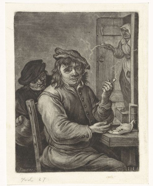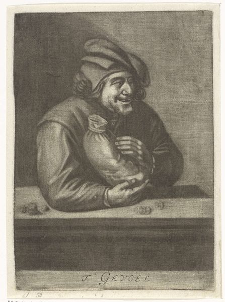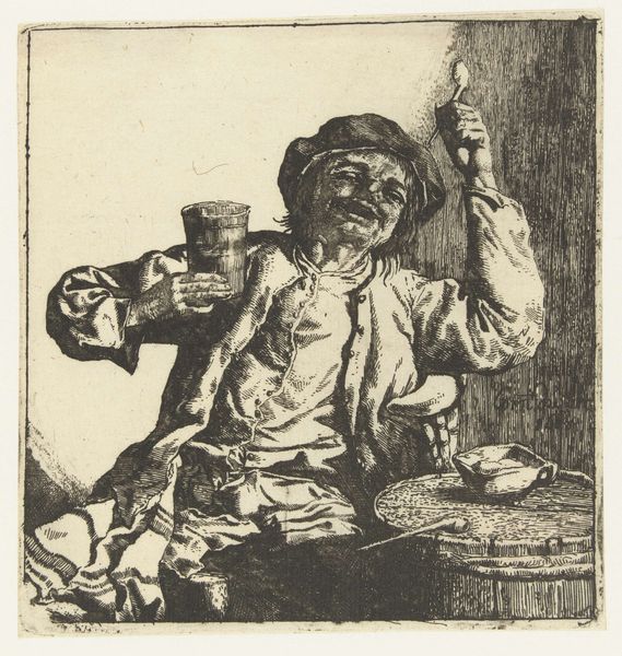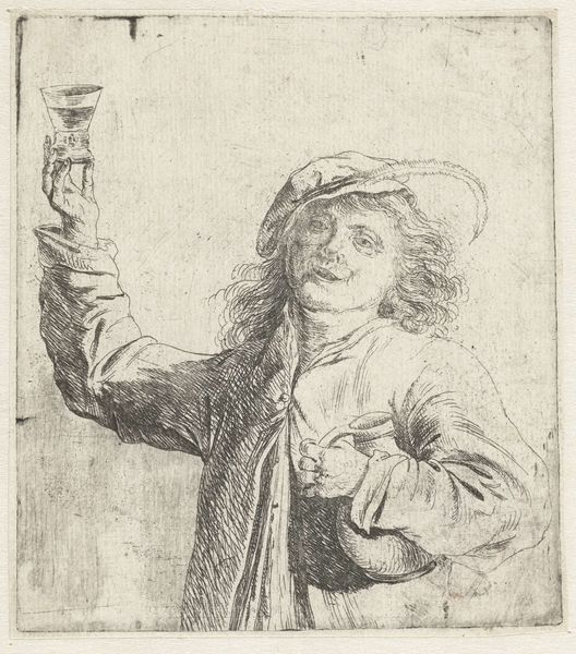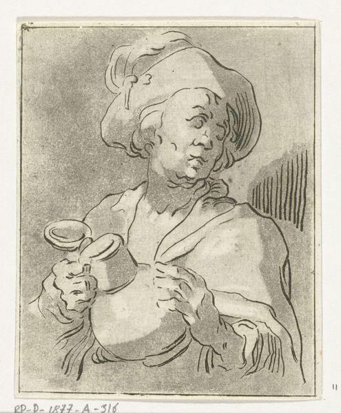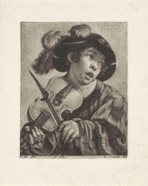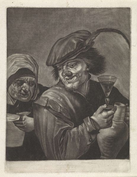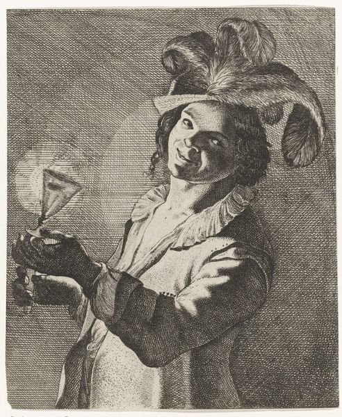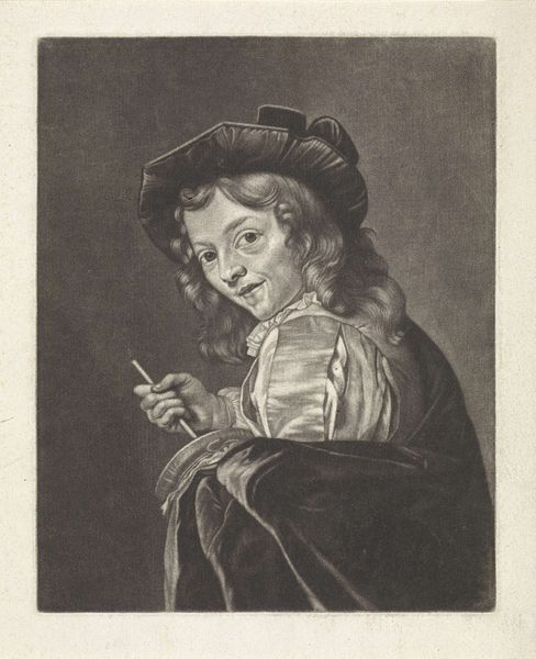 Michiel Gillig created this mezzotint print of a flute-playing boy in the late 17th century. Mezzotint is a printmaking process that relies on creating tone, rather than line. The metal plate is roughened evenly to hold ink, then areas are burnished smooth to create lighter tones. It's a labor-intensive technique, requiring great skill to achieve the subtle gradations of light and shadow we see here. Look closely, and you'll notice how Gillig's masterful manipulation of the medium gives the image a velvety texture. The boy's clothing, the feather in his cap, and even the light reflecting off the glass, all benefit from the richness that mezzotint can offer. Consider, too, that in Gillig's time, music was becoming increasingly accessible to the middle classes. This print, with its celebration of artistic practice, reflects a broader societal shift in tastes and values. Appreciating the skill that went into both playing the flute, and creating this print, allows us to fully appreciate the artistry on display.