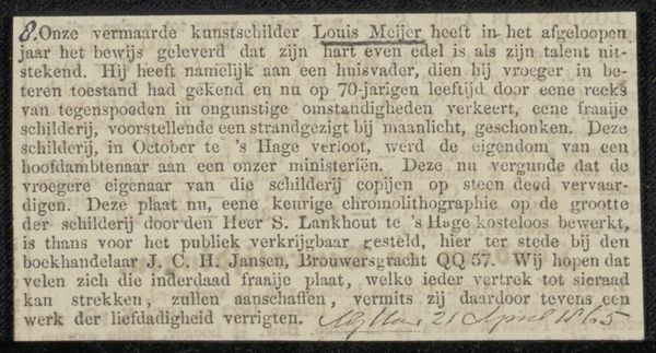 This anonymous news clipping, likely from the early 20th century, serves as an obituary for the Dutch painter, J.H. Weissenbruch. It traces his artistic journey from his early studies to his rise as a landscape painter, whose work captured the spirit of the Dutch countryside. The article hints at the politics of art and recognition. It notes the popularity of Weissenbruch’s paintings not just in local museums, but also in America, suggesting the global appeal of his vision. Weissenbruch found inspiration in the landscapes around Haarlem, Katwijk, and the Hague, painting scenes of the Dutch countryside. This small, fragile piece of newsprint speaks to the ephemeral nature of fame and memory. It encourages us to consider the artist's identity as it was curated and presented to the public at the time of his death. It reminds us that the reception of an artist's work is always mediated by cultural forces.