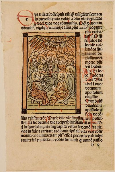 Curator: This "Illustration XIV," an anonymous piece from the Harvard Art Museums, presents a fascinating scene. The colours, though somewhat faded, still convey a sense of drama. What jumps out at you? Editor: The composition feels quite busy, with text crammed around the central image. It gives off a rather oppressive vibe, if that makes sense. What do you see in this piece? Curator: I think your 'oppressive' is spot on. To me, it seems to depict a moment of judgment or perhaps even torture, judging by the body language. The artist’s lack of a signature allows the viewer to focus on the scene’s raw emotion. Editor: I see that now; it does have a strong emotional charge. Thanks for helping me appreciate this piece more deeply!