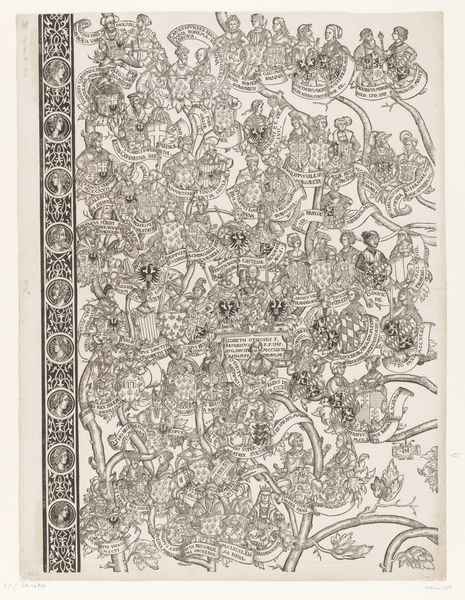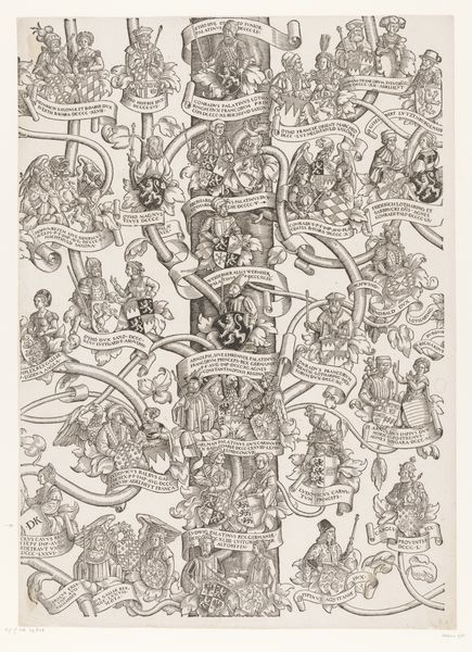 Jakob Clauser made this print, "Stamboom van Frederik en Ottheinrich van Palts-Neuburg", using the technique of engraving. Clauser cut lines into a metal plate, likely copper, which would have been a labor-intensive and highly skilled process, and then used ink to transfer the image to paper. The very act of producing this elaborate family tree elevates the status of its subjects. The linear precision of the engraving, combined with the intricate detail, lends an air of authority and permanence. Look closely, and you'll notice the texture of the paper itself becomes part of the image, adding depth and a tactile quality. Engraving, in this context, is not just a reproductive process. It's a means of enshrining lineage. The amount of work involved speaks to the importance of genealogy in maintaining social and political power. The print becomes a commodity, circulated and displayed as a testament to the family’s enduring legacy. By understanding the material process behind this print, we can appreciate how it actively shapes and reinforces the social structures of its time.
