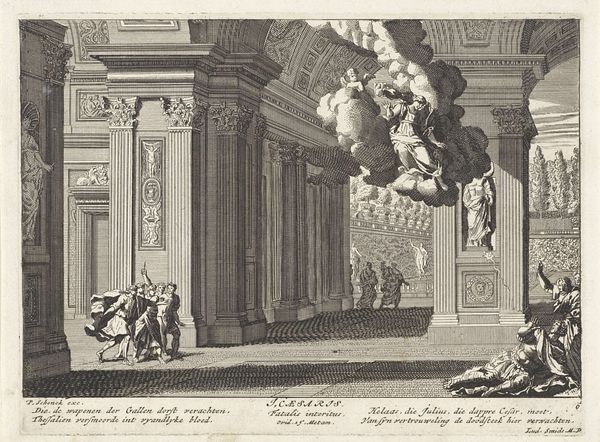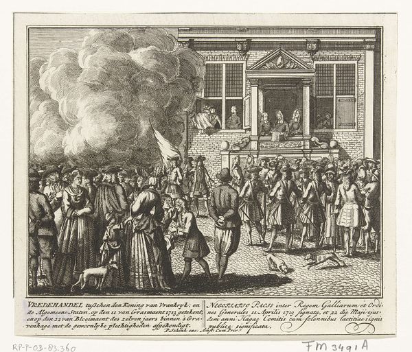 Curator: This print, dating from 1725 to 1727, is entitled "Intrede van landvoogdes Maria Elisabeth van Oostenrijk te Brussel, 1725," or "The Entry of Governor-General Maria Elisabeth of Austria into Brussels, 1725." Editor: It has such a crisp, clean feel for a historical print! The contrast really makes the scene pop; you can practically hear the bustle and ceremony. What kind of paper and ink were used? I'm interested in the production values. Curator: It's an engraving by Leonard Schenk. Looking at the work through a historical lens, the imagery is obviously highly staged to legitimize power. The walls of Brussels become a proscenium, a theatrical space for projecting Maria Elisabeth's authority. We have a procession moving towards the city gate; fireworks exploding overhead give a triumphal aura. Editor: Right, staged. I’m also wondering who made this image, how long it took to produce the plates, and under what conditions the labor was performed. How was Schenk compensated? The very lines composing the walls and faces imply production questions, each incised line the trace of someone's labor. The sheer detail hints at an intense investment of time. Was it piece work, an hourly rate, or what? These prints must have been widely disseminated to communicate this arrival, no? Curator: Exactly. These images were crucial tools for disseminating political ideology and maintaining social order. The baroque style itself communicates status; look at the billowing fabrics, the formal arrangement of figures! Editor: And, of course, how it affected the consumption of related luxury goods and services, all spun out from a few engraved plates! The demand this arrival manufactured; one woman's material impact writ large. It is far removed from a 'naturalistic' depiction and presents an idealized vision for public consumption. A vital insight on how such crafted depictions of leaders were used in governance! Curator: Precisely, seeing beyond just aesthetic pleasure brings vital layers to how we see it. Editor: Agreed. Thinking about it, focusing on how this artwork came to be and its historical usage illuminates not only its production but also its far-reaching societal effects.