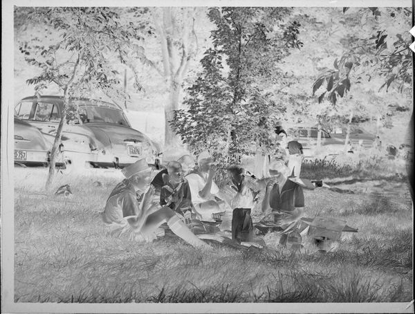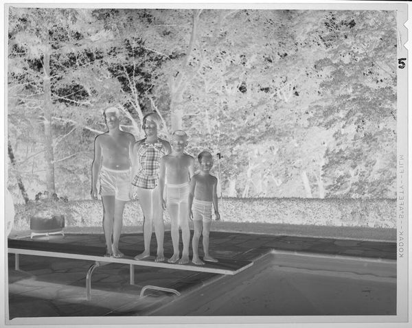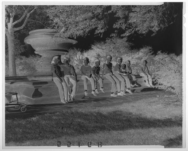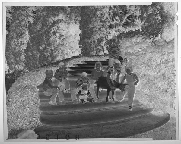 Editor: Martin Schweig's silver gelatin print shows nine kids with a goat on some outdoor steps. The inverted tones give it a ghostly, dreamlike quality. What's your take on this unusual composition? Curator: It feels like a memory, doesn’t it? Distant and slightly off. Perhaps it's a reflection on childhood itself – a bit chaotic, a little unsettling, but ultimately, full of life. The goat, that’s the wild card, isn’t it? Editor: Yes, the goat is definitely unexpected! What do you think it symbolizes? Curator: Maybe freedom? A touch of untamed nature amidst the posed formality. It makes you wonder about the story behind the image, doesn't it? I'm left pondering the narratives held within.