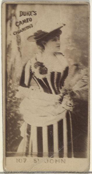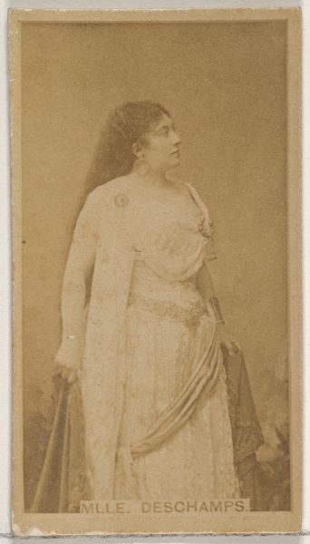 This is "Card Number 739, Erminie Vaughan," created by W. Duke, Sons & Co. as a promotional item for Cross Cut Cigarettes. The sepia tones and compact size immediately suggest its origins as a commercial artifact. The composition is carefully constructed. Erminie Vaughan is positioned off-center, yet her gaze meets ours, creating an immediate connection. The backdrop, with its floral motifs, contrasts with the geometric precision of the table, highlighting the interplay between nature and artifice, which were common in the 1890s. Consider the use of light and shadow. The soft, diffused light gently models Vaughan's features, while deeper shadows define the intricate carvings of the table. This subtle manipulation of light adds depth and realism to the image. The image thus challenges us to consider how representation and advertising intertwine, shaping perceptions of beauty and desire.