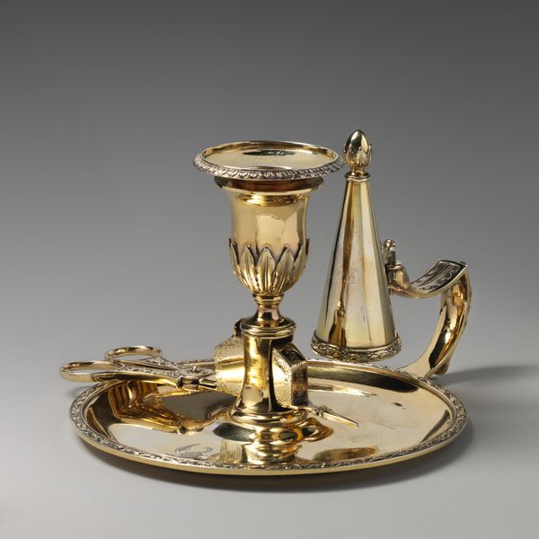 Curator: This beautiful three-light Candelabra, made of silver around 1800, stands before us here at the Minneapolis Institute of Art. Editor: Ooh, I get a distinctly 'drawing-room drama' vibe from this. It's all poised elegance, but with a touch of austerity too, isn’t it? Very late 18th-century repressed longing. Curator: Exactly! Its Neoclassical design certainly evokes those refined sentiments. The smooth, unadorned surfaces and geometric symmetry, particularly the square base and clean lines, speak to the period’s embrace of classical ideals. Think about how light would play on that surface! Editor: True, and structurally, the candelabra presents a study in balance. The verticality of the central stem countered by the curving arms is striking. The anonymous craftsman who made this had a keen eye for the interplay of solid and void. Curator: I imagine it placed centrally on a formal dining table. Each upward curve reflecting the candlelight, playing across polished wood, glinting off wine glasses. A symphony of light. Don't you think the severity of the metal actually helps cast that romantic shimmer in its surroundings? Editor: Perhaps the severity lends gravitas? Consider how the craftsmanship underscores value, power and the permanence sought through classical motifs during times of sweeping social change... or, you know, it's also just very shiny and looks pretty. Curator: There's certainly that element of display; to commission a piece like this demonstrates considerable wealth. But the very restraint suggests taste and an avoidance of vulgarity. It hints at an interior life filled with intellectual pursuits! Or, more practically, the latest card game craze! Editor: In a broader sense, it is an eloquent embodiment of a transitional moment. As the opulence of the Rococo period faded, society searched for something solid. Neoclassicism’s stoic formalism offered exactly that sense of visual grounding, if that’s what you’re seeking to do in your aesthetic analysis. Curator: Maybe a little less intellectual grounding is in order, but a good observation! Either way, a captivating object—beautiful in its balance and its subtle play of light. Editor: Indeed. It invites us to reflect on design, on material culture, and on the delicate negotiations between aesthetics and meaning. A surprisingly rich experience.
