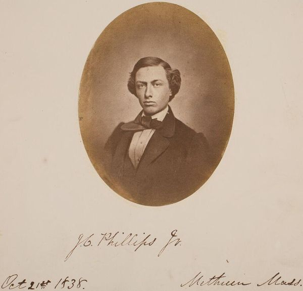 Curator: Here we have John Adams Whipple's portrait of Robert Noxon Toppan, a New Yorker, captured sometime in the 19th century. It’s a small albumen print, only about 14 by 11 centimeters. Editor: There's something so hauntingly gentle about it, isn't there? That soft sepia tone, the way his eyes seem to almost plead from the oval frame... Curator: Oval format was typical then, focusing our attention on the sitter. I'm particularly drawn to the tonal gradations—see how Whipple uses light and shadow to sculpt Toppan’s face, really defining his features? Editor: It's like holding a moment suspended in time. Do you think he knew what the future held, staring into that camera? Perhaps he felt the weight of history, just like we do, looking back at him. Curator: Photography in this era was still quite novel. I wonder if Toppan saw it as a scientific marvel or a means to immortality? Editor: Maybe both. Makes you think, doesn't it? It's more than just a picture; it's a conversation across the ages.