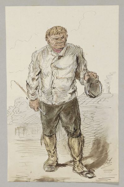 Editor: So here we have "Calabrian" painted by Mariano Fortuny Marsal in 1868. It's done in watercolor. It has such a wistful mood to it, almost melancholic. What stands out to you? Curator: Oh, I'm immediately struck by how Fortuny captures a certain...essence of the man. There’s this incredible fluidity to his lines. It feels almost like a fleeting memory, doesn’t it? As if we've caught him mid-thought, or mid-gesture. He is somehow both present and just out of reach, do you see? Editor: Absolutely. I see that in the soft blending around his figure and how some features, like the hands, are less defined. It creates that dreamy quality. Curator: Exactly! The blurring contributes a certain "romantic" feeling. Do you find his attire telling? The dark hat and worn vest imply something specific, maybe profession? Social Class? Even story of life? What comes to your mind when you look closer at those things? Editor: Hmmm, I'd guess he’s maybe a traveling tradesman or agricultural worker, based on the rustic clothes. But it is interesting how those clothes could point to a specific trade or class in society back then. Curator: It makes you wonder, doesn’t it? Art isn’t just about beauty, it's about history whispered through pigment. Editor: I never thought of it like that before, kind of makes you wonder what kind of life he was living and how society viewed him. Curator: Precisely! Now you're getting a deeper sense for its richness, maybe with some poetry along the way.