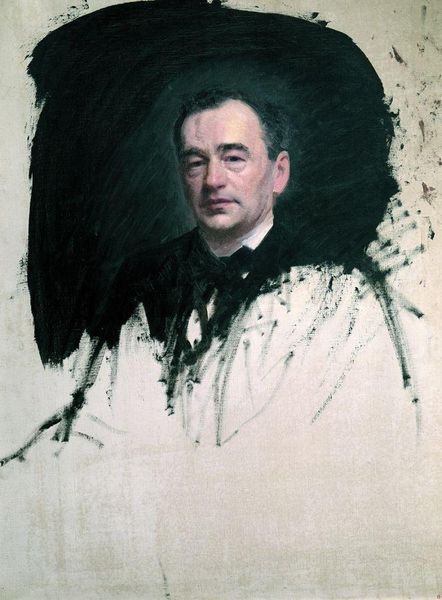 Editor: We're looking at Magnus Enckell's "Portrait of the Poet Otto Manninen," painted in 1903 using oil. It has such a studious, almost melancholy air to it. All the clutter on the table speaks to his intellectual life, but also feels…overwhelming. What stands out to you in this piece? Curator: The setting is key here. Consider the institutional framing of artistic production at the turn of the century. The image isn't just *of* a poet, but stages him within a clear visual metaphor of artistic labor and intellectual pursuit. Manninen isn't depicted in nature, for instance, or engaged in conversation; he is shown amidst the tools and products of his work: books, papers, ink. Enckell subtly elevates the *idea* of poetry itself. Do you see any tension between this elevation and the 'melancholy' you mentioned? Editor: Absolutely! The weight of all that "labor," as you put it, almost seems to bear down on him. He isn't gazing out into the distance, dreaming; he is literally surrounded by stuff. It reminds me how we romanticize art without acknowledging how the demands and social expectations might feel stifling. Curator: Precisely. Also consider who commissioned this work, how it was exhibited, who had access to view it, and its function. A painting like this was meant to not only immortalize Manninen but to validate and solidify the cultural position of Finnish artists and intellectuals in a rapidly changing society. It's as much about nation-building and cultural authority as it is about one man. Editor: That reframes the painting entirely! It's fascinating to think of a portrait functioning as a kind of cultural statement, legitimizing the artist and his milieu. I'll definitely view these "painterly" depictions through a different lens from now on. Curator: Glad I could help shed a different light! There's much to be discovered beyond aesthetics!