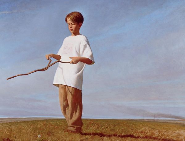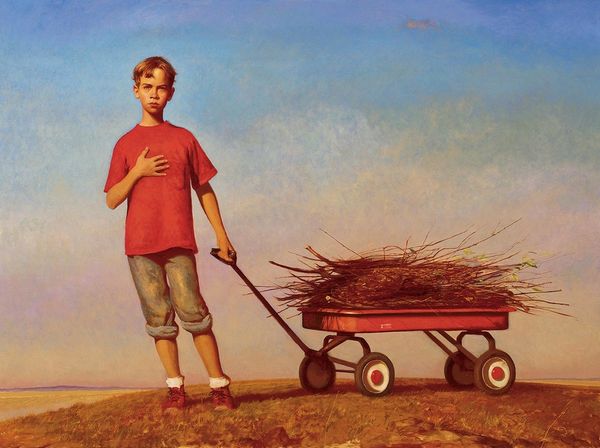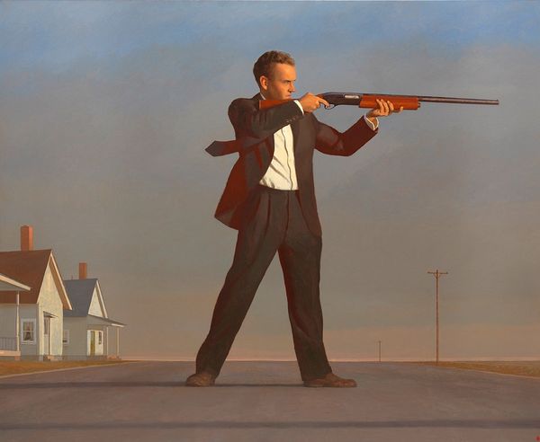 Bo Bartlett painted "Empire," sometime after 1955, using oil on linen. In it, a lone figure stands atop a barren mound, gazing out at a scorched landscape. Bartlett, who grew up in rural Georgia, has long been interested in exploring quintessentially American themes within his work. The figure’s mohawk hints at a certain kind of rebellion. His gaze is ambiguous: is it one of hope or despair? The sickle in his hand evokes images of labor, land and perhaps a sense of impending conflict. The scenes of destruction in the background suggest a world scarred by industrialization or war, and the solitary figure becomes a symbol of resilience and defiance in the face of environmental catastrophe. "Empire" invites us to contemplate our relationship with the land, and the consequences of our actions upon it. It is a call for awareness, urging us to confront our own roles within this unfolding narrative.