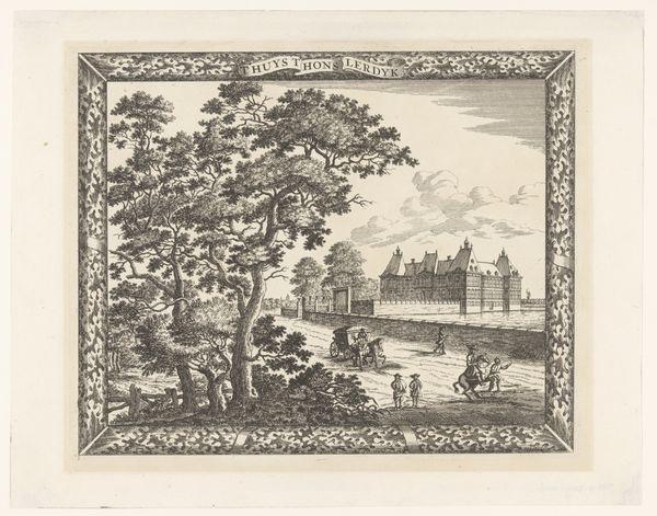 Cornelis Elandts created this image of Gezicht op Kasteel Westerbeek bij Den Haag, or View of Westerbeek Castle near The Hague, during the Dutch Golden Age. Elandts’s engraving offers more than just a scenic view; it provides a window into the social stratifications of 17th-century Dutch society. The castle itself, set back amid the trees, symbolizes wealth and power, while the figures in the foreground represent various social classes. From the seated man on the left, perhaps a traveler or worker taking a rest, to the more affluent-looking individuals strolling along the path, each figure tells a story of their place within the social hierarchy. The meticulous detail in the landscape, combined with the inclusion of these figures, creates a narrative about the relationship between the land, its owners, and those who inhabit it. This artwork prompts us to consider the stories behind such idyllic scenes. What were the lives of those who lived and worked in the shadow of such grand estates? How did they perceive their own place in relation to such visible displays of wealth and power?