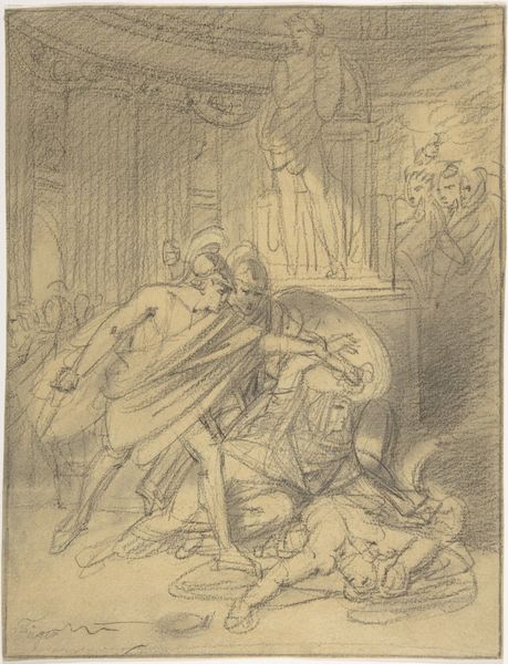 Curator: This pencil and paper drawing is entitled "The Raising of Eutychus," attributed to Pieter Fransz. de Grebber, and believed to have been created sometime between 1610 and 1652. Editor: A tad dramatic, wouldn't you say? Everyone seems so distressed! I love the swooping gesture of the raised hands—it really amplifies the tension of the scene. Curator: Indeed. The dynamism present derives significantly from its Baroque style. Note how the narrative art portrayed focuses primarily on figuration, with close attention paid to capturing emotive physical gestures. Editor: It almost feels theatrical, with figures posed just so. The whole scene kind of reminds me of watching an old silent movie; you know, exaggerated reactions everywhere? Do you get the same vibe? Curator: While the gestural exaggeration is prominent, as you point out, the success of its emotional resonance depends also on its composition. Observe how de Grebber utilizes layered perspective to lead our eyes from the prone figure to the apex of alarmed expression. Editor: See, that's the stuff I always miss, I'm too busy looking for stories and feelings. Like, is Eutychus just having a bad dream or something worse? Also, who exactly decided this called for so much hand-waving? Curator: Considering the drawing's title, we may presume Eutychus has suffered some calamitous fate—perhaps death—and is being miraculously revived. As for the gesticulation, well, such was the Baroque language of heightened emotion! Editor: Baroque indeed. So, this isn’t your typical chill Sunday sketching session; this is high drama sketched in pencil! I'll look at baroque art slightly differently now. Thanks! Curator: Then perhaps a fresh perspective has been illuminated, if only ephemerally.