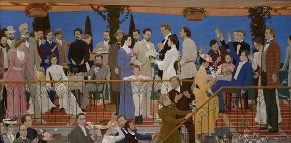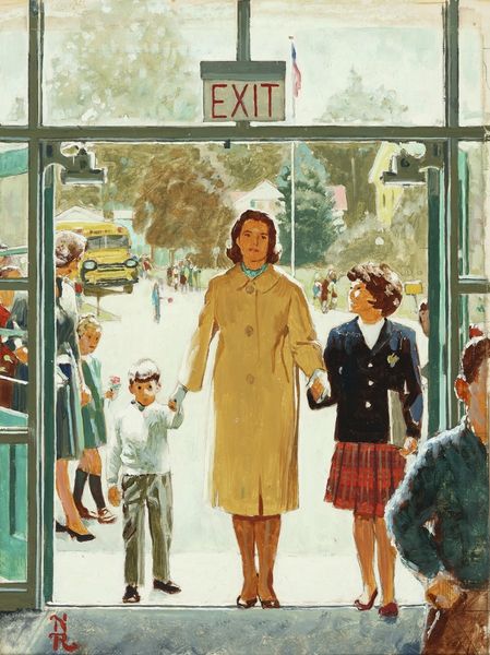 Tom Lovell’s painting "Son Of The Coach" is a captivating piece, likely made with oils, that pulls you into a mid-century narrative. Lovell's brushstrokes are confident and direct, giving the scene a crisp, illustrative quality. I love how the buttery yellow of the woman's coat contrasts with the muted tones of the background figures, making her pop. It's almost like a spotlight effect, drawing your eye to her uncertain gaze. The paint application varies – thicker in the highlights on her coat, thinner in the shadows, creating depth and form. I find the band in the background particularly intriguing, the quick strokes capture movement and energy, contrasting the stillness of the foreground. It reminds me a little of Edward Hopper's sense of narrative ambiguity, inviting you to fill in the blanks, to create your own story around the image. Ultimately, Lovell offers us a glimpse into a frozen moment, a slice of life filled with untold possibilities.