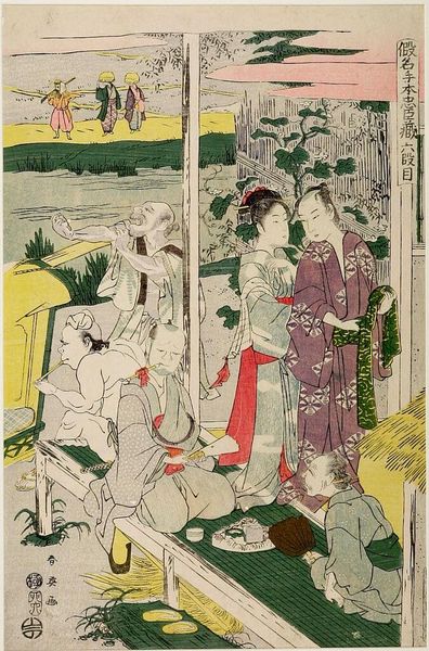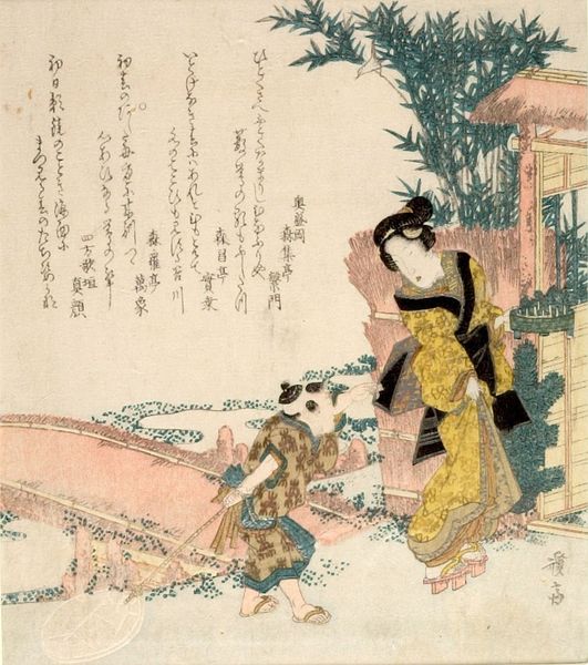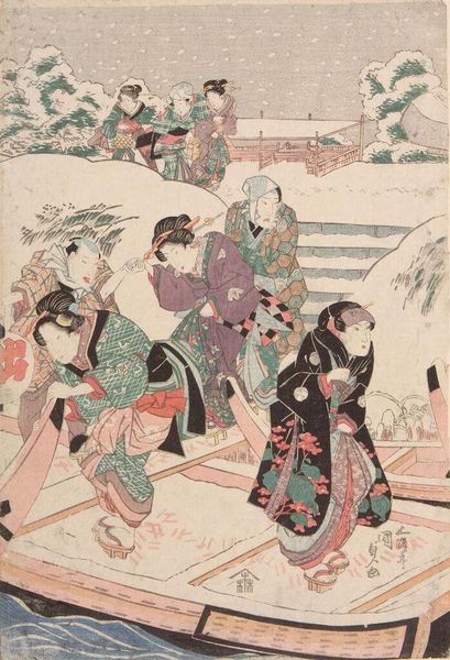 Editor: This is Utagawa Kunisada's woodblock print, "Evening Snow at Mimeguri". It depicts figures boarding a boat, and I’m struck by the contrast between the cold, snowy landscape and the vibrant patterns of their kimonos. What can you tell me about the social context of this image? Curator: Well, this print speaks volumes about leisure and entertainment in Edo-period Japan. The presence of actors and courtesans suggests a vibrant, yet exclusive social scene. How do you think the depiction of snow affects the perception of this scene? Editor: It makes it feel like a special occasion, a deliberate escape from the ordinary, almost theatrical. It makes me wonder about the relationship between art and entertainment in that period. Curator: Precisely! These prints were not just decorations but also served as publicity and records of popular culture. This piece certainly enriches our understanding. Editor: I never thought about these prints as tools that reflected the social landscape of the Edo period!