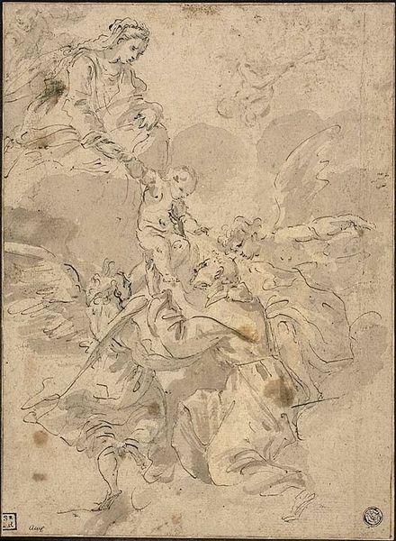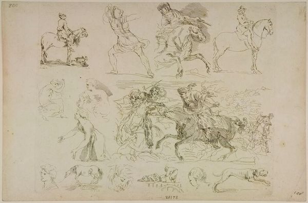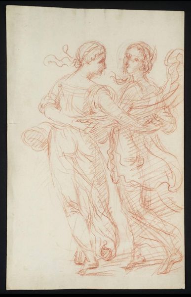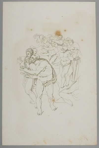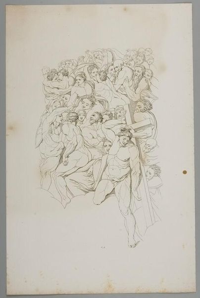 Editor: This is Tommaso Piroli's "Last Judgement". It's a sketch, and I'm immediately struck by how classical the figures look, even within such a dramatic scene. What symbols stand out to you? Curator: Consider the ladder, a visual echo of Jacob's Ladder, signifying ascent and divine connection. And the embrace—is it comfort, or perhaps judgement itself, a weighing of souls? What does the symbol of judgement represent for you? Editor: I hadn't thought of the ladder in that way. It adds a layer of hope. It's fascinating how these symbols persist across time. Thanks for that insight. Curator: Symbols are our inheritance, carrying meaning that evolves and deepens with each viewing. I'm glad we could look at this together.
