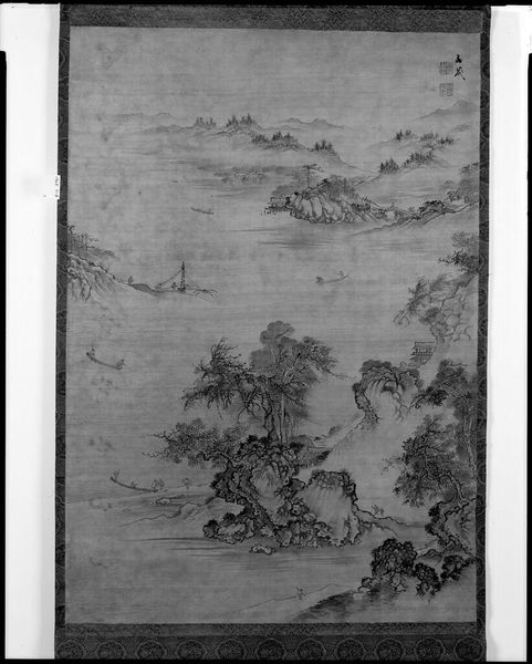 Curator: This is Tani Bunchō's "Winter Landscape," a hanging scroll held at the Harvard Art Museums. There’s no specific date, but Bunchō lived from 1763 to 1840. Editor: Immediately, I’m struck by its stark, almost desolate beauty. The monochromatic palette emphasizes the skeletal forms of the trees and the undulating hills. Curator: It's interesting to consider Bunchō's position within the Edo period. His work often synthesized Chinese literati painting styles with a Japanese sensibility. Editor: Yes, the composition feels very deliberate. See how the artist uses varied ink washes to create depth and atmosphere, guiding the eye through the scene. The lone boat hints at a human presence, yet emphasizes the overwhelming power of nature. Curator: The lack of color could also symbolize the austerity and hardship faced by many during the Edo period, reflecting the socio-economic realities of the time. Editor: Perhaps, but I see the absence of color more as a formal choice—a reduction to essential forms that elevates the landscape to an almost abstract meditation on nature. Curator: An insightful contrast! Editor: Indeed.
