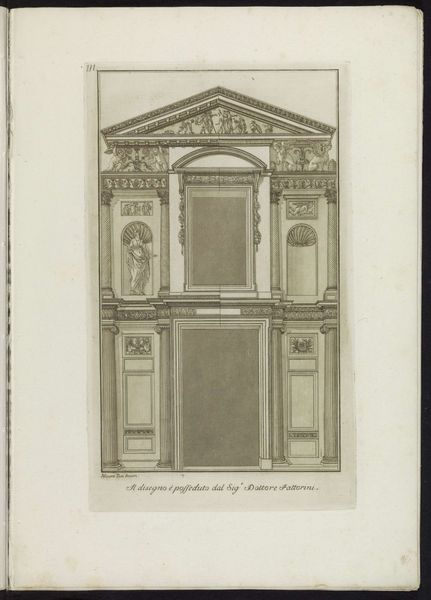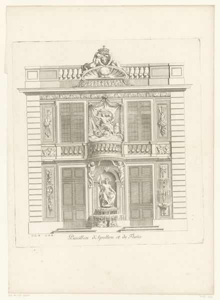 Editor: We're looking at "Paviljoen van Fama," or "Pavilion of Fame," an engraving by Louis de Châtillon dating from 1672 to 1686. It's quite austere, all straight lines and classical motifs. What stands out to you about its composition? Curator: The artist has orchestrated a rigid architectural symmetry, effectively dividing the image along a vertical axis. The Doric columns rhythmically punctuate the façade. The proportional relationships between the base, shaft, and capital of the columns speak to a specific system of classical aesthetics. Note the meticulous detail in rendering the entablature. Editor: Yes, the details are striking! The friezes above the doors and windows add another layer of detail. How do these decorative elements impact your reading of the work? Curator: These embellishments disrupt, yet reinforce, the underlying geometry. Consider how the curvilinear forms contrast with the rectilinear structure. We see a tension between ornamentation and structure. Moreover, it evokes, through semiotic coding, ideas of status and permanence through these iconographic figures and architectural referents. It invites the viewer to contemplate the essence of ‘Fame.’ Editor: It's interesting how the rigid structure highlights those subtle variations and decorations. I was initially focused on the overall form but now I notice the deliberate use of embellishment. Curator: Indeed. It speaks to the complexities inherent within formal structure; surface detail often reflects a deeper intellectual investigation. Consider the philosophical implications present when analyzing the structural elements and iconographic forms in isolation, together suggesting ideas of legacy and societal standing. Editor: Thank you. Looking at it now, I appreciate the level of detail within the rigorous structure, which provides the possibility for such nuanced contemplation.
