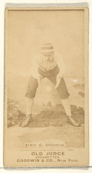 Curator: Immediately, the sepia tones evoke a strong sense of nostalgia and something undeniably vintage. The way the subject's body is tensed—he's ready to make a play. Editor: This is a card featuring Joseph "Reddy" Mack, the 2nd baseman for the Louisville Colonels, dating back to 1888. It's part of the "Old Judge" series (N172) by Goodwin & Company, originally included in Old Judge Cigarettes packs. The image itself would have been created through photography, then reproduced using printing techniques. Curator: Knowing that it was an item within cigarette packs gives us such different insight; these baseball cards were like, almost incidental, right? What's intriguing to me is that juxtaposition of athletics and something so explicitly associated with working class social culture at that moment: cigarettes. Editor: Absolutely, that material reality frames everything. The cards weren’t just celebrating athletic skill, they were driving sales. This mass production reveals a great deal about the intersection of leisure, consumption, and industrial printing. We see photography and printing working together as the media landscape evolves, but at the expense of labor—both literal factory production and more insidious issues of what labor will go to these "luxury" items versus things more fundamental to life. Curator: Thinking about the subject position is complex too, as Mack had quite a short career and seemingly little personal information that could be dug up nowadays, adding to the intrigue and prompting interesting intersectional questions on why particular histories and figures rise to public light, while many others stay hidden. This image, within that context, now stands in as a symbol of historical inequities surrounding who gets to be seen and remembered. Editor: Precisely. That's where art and social life are clearly intertwined. The physical object of the card connects labor to portraiture, revealing dynamics of early consumer culture and even challenging notions of photography's relationship to the every-day. Curator: Thinking about how these material artifacts shape narratives about labor and social identity, in their own small way, adds invaluable historical depth and provides crucial context on art historical power structures. Editor: It truly grounds these glimpses into social history, prompting questions about where the baseball cards were produced, who did the printing, and the social cost of making the Old Judge cigarettes affordable to a consumer base that may well have not had much disposal income.