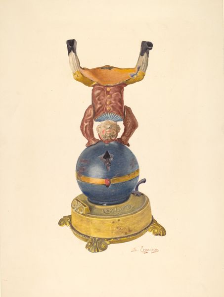 Editor: This is Al Curry's "Female Figure," from around 1937, a drawing in coloured pencil depicting what seems to be a carved object. I'm immediately struck by the sort of archaic, mythical quality it possesses, like something unearthed from an ancient civilization. How do you interpret this work? Curator: The work speaks to a persistent human impulse: the desire to translate the ephemeral into something tangible, to capture stories and beliefs in enduring forms. Note the lone figure beneath the tree, cradling what could be an instrument. Doesn't this evoke the image of the bard, the storyteller, the keeper of cultural memory? Editor: Absolutely. And the figures carved around the base - they look almost like ancestral figures or deities. Curator: Precisely. They could represent a lineage, a pantheon, or a cycle of life. The tree itself is a potent symbol, present in countless cultures as a representation of life, knowledge, and connection between the earthly and the divine. Editor: It feels like the drawing itself is trying to capture not just the object, but also the stories it holds, like a documentarian would capture an important historical moment. Do you think Curry was interested in how objects can embody narratives? Curator: Without a doubt. Look at the deliberate rendering of the carved details. It invites contemplation on what such forms meant to the civilization who might have created them, what emotions they were trying to evoke, what meaning they held, and how those meanings may continue to resonate across time. It's an evocative reminder that we’re always interpreting echoes of the past. Editor: That’s fascinating; I hadn't considered it that way. I guess this piece reminds us that symbols can tell entire stories if you know how to look. Curator: And perhaps also that even without knowing the specifics of the story, the very act of trying to decipher it is meaningful. We engage with history in the process.