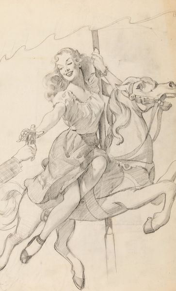 Editor: This is "A Knotty Problem," a 1950 pencil drawing by Gil Elvgren. It's… definitely of its time, and the title feels like a bit of a wink. She's reading "Infant Care," tugging at her skirt… I'm getting a real feeling of playful exasperation from this. What do you see in it? Curator: Oh, this brings me back! Beyond the obvious, let’s wander into what Elvgren's *not* showing. That frustrated glance paired with "Infant Care"... Do you see that almost subversive humor peeking out? He is definitely tickling the zeitgeist. Editor: Subversive? I guess I hadn’t thought about it that way. More… complicit, maybe? But the book adds another layer. It’s unexpected, right? Curator: Exactly! It's a delightful juxtaposition, isn’t it? It's about the story of a woman stepping into her next act, where life’s about to hand her… well, handfuls. It’s a giggle disguised as a pin-up. He wants to catch you off-guard before you know how deeply it resonated at the time – and how it continues to do so today, even if the underlying sentiments are now being questioned. Editor: I can see that. So, more than just a pretty face, it's capturing a moment of…transition? Curator: Precisely. The skill is not just in the drawing but the entire tableau he's crafted, even down to the title itself. And the technique. Notice how much he suggests with so little, all these delicate strokes coming together. The magic lies in the question he poses…can she untangle this particular knot? Editor: Okay, I’m seeing it now. It’s making me think about the expectations placed on women, both then and now. Thank you! Curator: And thank you for noticing and helping me clarify *my* thoughts on this sly little number. It shows how art can evolve along with us.