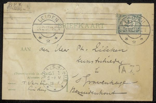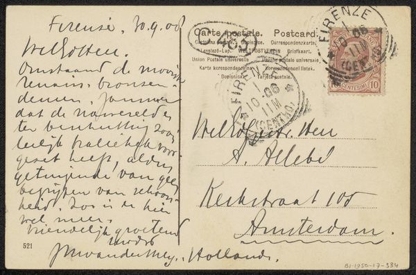 Curator: Let’s begin. This postcard, “Briefkaart aan Philip Zilcken,” was made by F.M. Melchers likely before 1928. It's ink on paper. The artist is corresponding to an address, and the entire thing is rendered in his pen. Editor: It looks like an informal work, perhaps a draft of a story or personal sketchbook page. What aspects of its composition or technique stand out to you? Curator: The balance is intriguing. Note how the stamp and postmarks are situated at the upper right, nearly mirroring the artist’s address on the left. This simple, nearly symmetrical organization contains an inherent stability, yes? Editor: I see that now. It’s like a rudimentary grid system is in place. Do you find that the placement of the text, almost calligraphic in style, contributes to the composition's aesthetic? Curator: Precisely! Observe the line quality – at times thick and emphatic, then delicate and flowing. This variation lends a rhythm to the whole piece. One could suggest the act of handwriting transforms utilitarian correspondence into an exercise in mark-making. Note how the writing style contrasts with the geometrical and rigid appearance of the stamps. Do you agree with such formal contradiction in play here? Editor: Yes, the differences highlight each element. Together the postal stamp, cancellations, and penmanship all form distinct spatial regions on this intimate card. Thank you for pointing this out! Curator: It shows how visuality pervades every aspect of human lives through this form of communication, from the bureaucratic elements such as postage to personal writing and gesture. Editor: I hadn't thought about it like that before, but it’s true – it transcends function and enters the realm of aesthetic consideration.