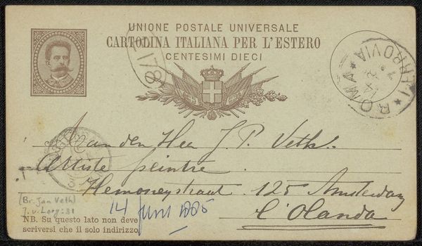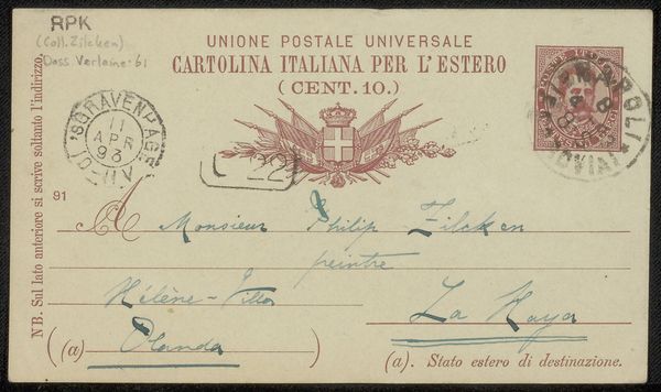 This "Briefkaart aan Philip Zilcken", made by F. Camerom, presents a fascinating study in signs, symbols, and the architecture of communication. At first glance, the eye is drawn to the symmetrical arrangement of national emblems—flags, a crown, and an escutcheon—printed in a muted red, balanced by the cancellation stamp to its right. Below, the handwritten address in elegant cursive adds a personal touch. The rigid lines of the postal form contrast starkly with the organic flow of the handwriting, creating a visual tension. Structurally, the card uses semiotic codes of nationality and formality, typical of postal communication. These printed elements frame and formalize the personal message, while the handwriting injects individuality into the standardized format. The text "Olanda" and "La Haye" are more than place names; they act as signifiers of national identity and geographic location. Ultimately, this card exemplifies how even the most mundane objects can be rich with meaning when viewed through the lens of structural and formal analysis.