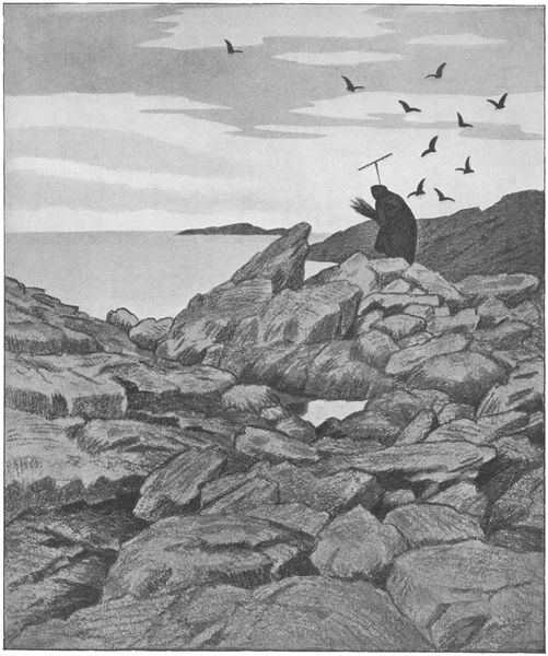 Curator: Theodor Kittelsen’s drawing, "Mor Der Kommer En Kjerring" from 1900, is before us, rendered in pencil and charcoal. Editor: There's an immediate sense of foreboding here. The stark black and white, the lonely figure—it feels almost theatrical, a stage for something grim. Curator: Absolutely, and Kittelsen was deeply invested in folklore, in how the myths and societal fears were embodied, particularly regarding the roles assigned to older women and marginalized people. Editor: That's evident in the rendering; the lines of the landscape almost seem to press in on the central figure, emphasizing that her materiality comes from the labor and struggle with her environment. Curator: Precisely. It evokes questions of visibility, especially concerning aging women. How are they perceived? Are they figures of comfort or sources of dread? Editor: The ravens, or crows, circling overhead definitely amplify that dread. They suggest an environment ripe with death or decay—perhaps representing societal views towards women of that age. I am drawn to the lines of charcoal in her robes. Curator: Notice how her form seems to melt into the surrounding forest. Her isolation speaks volumes, both on a social and political level. She has this walking stick too, suggesting not just old age but a need for assistance to be able to perform daily labour. Editor: And her connection to the land feels powerful but oppressive. The way her labor is intimately bound to the landscape’s texture—the harsh, unforgiving lines creating the foliage around her—underscores a relationship of survival, not leisure. Curator: Consider the era as well—the turn of the century—when Norway was seeking a distinct national identity. Artists were looking to the local folk tales to build an authentic image. Works such as these reinforced established power dynamics through those characters. Editor: Kittelsen uses humble materials to give form to grand, unsettling themes; a single point can shift my gaze to a sense of existential unease that I keep trying to resolve, like it asks who this artwork truly seeks to serve. Curator: It’s a dark look, but one that's honest. By revealing it, Kittelsen questions what we prefer to hide when looking at gender and the elderly. Editor: A chilling portrait, constructed from lines and anxieties as he creates the representation of aging and alienation from materials readily at hand. It is as striking today as I am sure it was then.