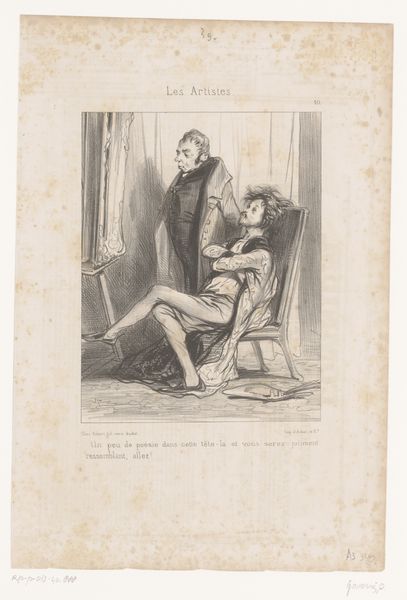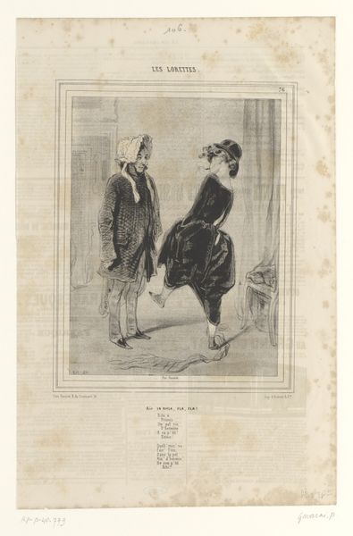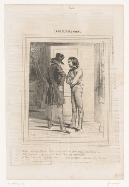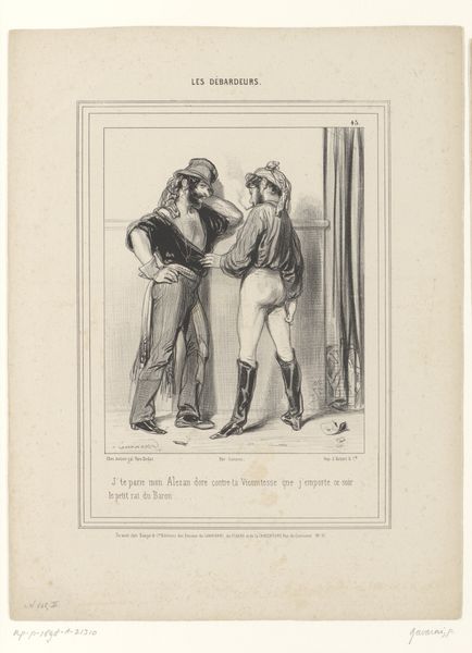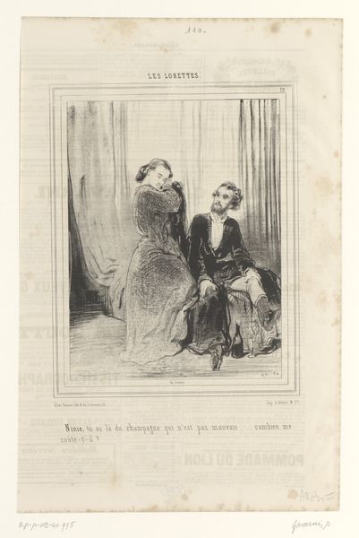 Editor: This is "Jongeman dingt naar de gunsten van een prostituee," or "Young Man Sues for the Favors of a Prostitute" by Paul Gavarni, a lithograph from 1846, currently residing at the Rijksmuseum. The title certainly sets a scene! There's a definite story here, almost like a freeze-frame from a play. What strikes you most about this piece? Curator: Oh, it's Gavarni, ever the keen observer of Parisian life! The beauty of a print like this lies not just in the scene depicted, but also in Gavarni's ability to capture the undercurrents of societal norms. He gives us not just a representation, but the breath and nuance of real-life social exchange. I am always reminded of Balzac's vivid scenes! Have you considered how he subtly hints at the power dynamics through posture and expression? Editor: Absolutely! The young man's somewhat pleading expression, the way he's holding his hat… He's definitely not in a position of power. But there's also a bit of humor in it, isn't there? It doesn't feel overly tragic. Curator: Precisely! It is a societal comedy as filtered through a Romantic lens. Note the almost theatrical staging of the scene with its "backstage" drapery; this element further elevates this drawing and speaks to a tableau vivant quality inherent within! Does this change your initial reading of this work, perhaps? Editor: It does! I hadn't really considered it in that way. Now, the expressions of the two figures really feel even more deliberately arranged, as if part of a stage play. Curator: Right! So, it evolves into this fascinating commentary on social mores – with a sprinkle of romance and theatrics! We laugh, we ponder and it makes us ask ourselves, who holds the real power here? Food for thought indeed! Editor: Definitely some fascinating new avenues to explore there, viewing the image through a more theatrical lens certainly reveals its richness.