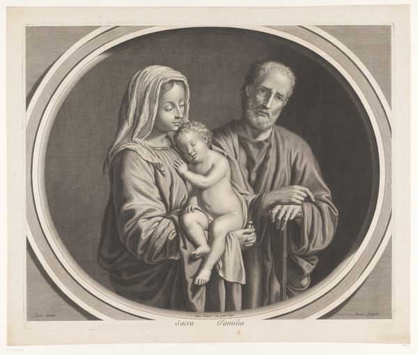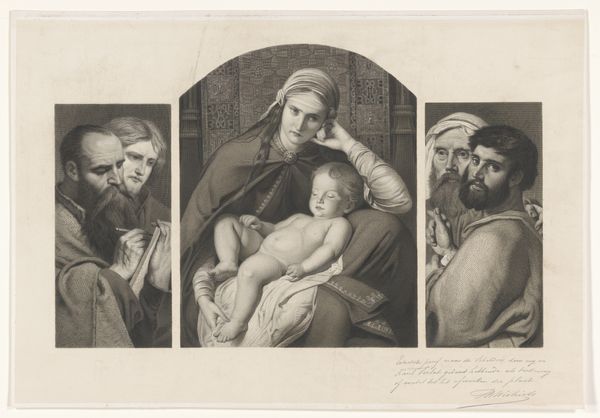 Josef Löwy created this photogravure of a painting depicting Christ, Mary, two kings, and a shepherd in the late 19th century. Löwy was working in a period where Vienna's Jewish population was experiencing growing pains; increased rights coupled with rising antisemitism. This image, a reproduction of an older painting, speaks to complex relationships of power and faith. Mary, central and draped, is the only woman; she is beatific and burdened by her role. The depiction of the infant Jesus as distinctly male and naked touches on themes of vulnerability and divinity, challenging conventional representations of holiness. The solemn expressions of the figures evoke a sense of reverence, yet their placement within the composition invites us to reflect on the dynamics of spectatorship and participation in religious narratives. It suggests questions about who is welcomed, who is marginalized, and whose stories are told and retold. Löwy’s work invites reflection on the personal dimensions of faith and the broader social structures that shape religious expression.