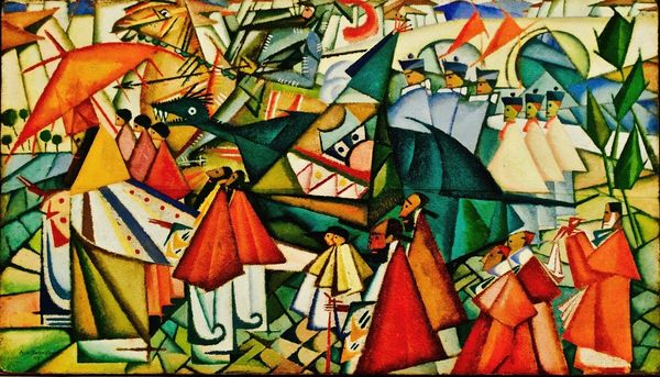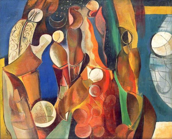 Editor: So, this is "Intifada" by Alexander Bogen, painted in 1991 using oil paints. It's… chaotic, wouldn’t you say? Almost unsettling with those clashing colours and vaguely figurative shapes. What do you see in it? Curator: Unsettling is a great word. It’s a controlled explosion, isn't it? Bogen, with his deeply personal expressionism, seems to be channeling raw emotion here. I see fragmented figures, a sense of struggle, perhaps a disruption of order. The bold colors, while clashing, create a sense of urgency. It’s like he's throwing paint at the canvas to capture a feeling, not just a scene. Does it speak to you on an emotional level? Editor: It does, definitely. I get a sense of… violence, but also maybe resilience? Like something being broken down but also fighting back? Is that too literal an interpretation? Curator: Not at all! The "Intifada" in the title gives us a strong clue – a Palestinian uprising. Knowing that, the fragmented figures could represent individuals caught in conflict, their identities fractured by the violence. But that “fighting back” you sense is key. The dynamism of the brushstrokes, that almost frantic energy – it speaks to resistance, doesn't it? Almost like music with jarring chords, unresolved. Editor: I didn't catch the title's reference. That shifts my perspective quite a bit. The clashing colours suddenly seem deliberate, mirroring the conflict. Curator: Exactly! And Bogen, having lived through intense historical periods himself, funnels all of that emotion, right? Into the work. He's not just depicting an event; he’s embodying the emotional impact. What began as unsettling perhaps, now is something closer to a visceral kind of truth. Editor: Wow, I came in seeing chaos, but now I see… purposeful chaos. I see layers of meaning, resistance, and personal experience woven in. Curator: And that's the magic of art, isn’t it? To go in blind, and feel the scales shift!