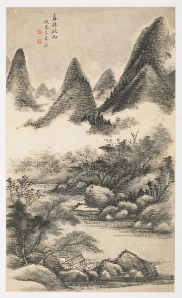 Curator: Looking at "Misty Landscape," created in 1878 by Wang Yin and displayed here in the Minneapolis Institute of Art, I’m immediately drawn to the atmosphere it evokes. There’s a soft, ethereal quality achieved through ink and light washes, typical of the Japanese hanging-scroll style. Editor: It's interesting how that ethereal quality simultaneously calms and unsettles me. The deliberate emptiness of the space feels heavy, pregnant with unseen narratives, reflecting perhaps the instability and societal shifts of its time. The lingering shadows cast a long and dark mood upon the depicted rural environment and people Curator: I see what you mean. Shadowy tones tend to emphasize this effect. The artist, through skilled application of ink washes, builds a dialogue between the concrete forms of mountains and trees and the transient nature of mist, symbolizing perhaps the elusive search for permanence within the natural world. Wang uses an amazing and impressive form of linear and aerial perspective within an asymmetric pictorial space! Editor: And consider those small human figures in their fragile boat. What did they see? How has rapid societal modernization impacted their world, their relation to natural resources and the world's population growth rate, which have placed new demands on nature? How does their way of life compare to what’s valued now? Are they merely elements in a pretty picture? Curator: No, their presence is crucial. The figures in traditional Asian landscape painting remind us of our place in the cosmic order. Like small cogs on a very large clock, we can easily get misplaced within it. So in my reading their figures also reinforce the sublime power of nature, while these elements, like the pine trees are indicators of moral character in line with the Literati tradition. This reflects Confucian beliefs as a microcosm, highlighting how moral men are pillars of society during dark times. Editor: Right. But let’s be real; that perspective tends to downplay their real-world challenges. Who gets to define the good? And at what cost? Perhaps seeing the ink and landscape style through an eco-critical lens allows us to reveal something, while making art more approachable and even relevant in its time! Curator: Maybe…it's a beautiful example of what has been called "sumi-e," literally, ink picture. Editor: A method and tool in seeing our place. Curator: Or seeing something from another's place.