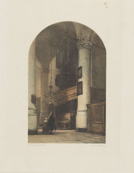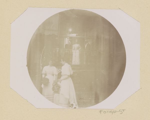 Curator: Look at this gorgeous silver gelatin print, dating from between 1889 and 1893, titled "Gezicht op een steeg in Pisa" – or "View of an alley in Pisa." It's the work of Johanna Margaretha Piek, and quite something. Editor: My first thought? Ghostly. Not scary, but…there’s a temporal distance, like peering into a memory. The tones are muted, and it's all framed in this… almost porthole-like shape. Very intimate. Curator: Piek’s work often explored cityscapes and everyday life through a lens that aligned with Pictorialism. Notice how it echoes post-impressionist painting. It is like she isn't just recording but interpreting the scene. The people seem more like brushstrokes. Editor: Precisely! The blurred figures enhance that sense, these figures could mean something symbolic about the time it was shot, I see what appears to be two figures on wheeled seats. Curator: They could indicate travel, the inevitable journey that we are all making... Or perhaps the modern means of transport in 1890s. They evoke themes of ephemerality and transformation, of transition. Editor: Perhaps it represents, also, a modern update on traditional portrayals of the Three Fates or classical stories involving weaving on a loom, a modern-day twist to such historical images. The monochromatic tone further distills everything. No colour to distract from the forms and symbolism. It also emphasizes the past. Curator: Yes, by removing colour, the tones focus your attention on the geometry of the arcade and its relation to people moving along on these new wheeled contraptions! Which might easily go unnoticed if rendered in true colour. It transforms what could be banal, into an artful composition of light, shadow, and suggestion. Editor: It truly feels like stumbling upon someone else’s fleeting yet precious moment captured for us to observe through all time. Like eavesdropping on their inner thoughts. Curator: Absolutely. Johanna Margaretha Piek offered a unique voice blending both a painterly and a photographer's sensibility to everyday existence, allowing us, now, to reflect on themes still relevant to the way we inhabit our lives within built spaces today.