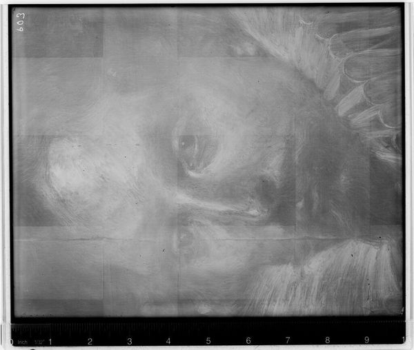 Curator: We're examining an X-radiograph of "St. Francis," attributed to Peter Paul Rubens. The piece resides at the Harvard Art Museums. Editor: My initial impression is one of ghostly forms. The image, lacking color, presents a somber, almost ethereal quality, revealing hidden layers beneath the surface. Curator: Indeed. X-rays such as this allow us to see alterations made by the artist, perhaps revealing changes in the saint's posture or the addition of symbolic elements. This process unearths decisions made, offering insight into the artist’s intent and the cultural symbolism embedded within. Editor: Structurally, the composition seems quite dynamic even in this abstracted form. The swirling patterns suggest movement and emotion, revealing Rubens’s skill even beneath the visible surface. Curator: Precisely. The X-ray serves as a powerful reminder that images hold deeper meanings, reflecting complex narratives of faith, artistic practice, and cultural memory. Editor: It's fascinating to see how the inherent structure and composition persevere even in this medium. It offers an entirely new perspective on artistic creation.