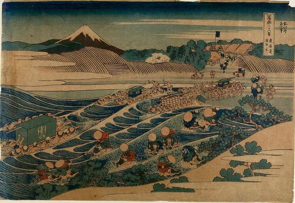 Editor: This is Hokusai's "Back View of Fuji from the Minobu River," part of his Thirty-Six Views series. It's a woodblock print, and it feels so much grander than its actual size. What captures your imagination most when you look at it? Curator: Oh, the way Hokusai plays with perspective! Fuji is almost shyly peeking from behind those other mountains. I imagine him chuckling, saying, "See if you can spot me!" It’s like a visual riddle, isn’t it? And those tiny figures in the foreground, dwarfed by the landscape...it's an invitation to contemplate our place in the world. Editor: I never thought of it as a riddle, more like a gentle invitation. Curator: Exactly! Art's all about perspective, isn't it? Hokusai’s just nudging us to see things a little differently.