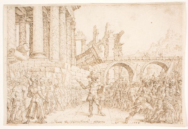 Francesco Guardi sketched these Venetian scenes using pen and brown ink, capturing a world animated by ruins and bustling quays. The architectural ruins, reminiscent of triumphal arches, serve as poignant symbols. These structures once celebrated power and empire. Yet here, they stand weathered and incomplete, acting as vanitas motifs that reflect the transience of human achievement. We see such ruins echo through time—from Roman frescoes to Renaissance paintings. They are perennial reminders of time’s passage and the cyclical nature of civilizations. Consider how the ruined arch appears in other contexts, such as Piranesi's engravings. In this context, it evokes a melancholic reflection on the grandeur of the past. Such imagery taps into our collective memory, conjuring feelings of nostalgia and the inexorable march of time. This composition, imbued with both energy and decay, invites us to contemplate how past glories continuously resurface. They evolve and find new meanings in our present.