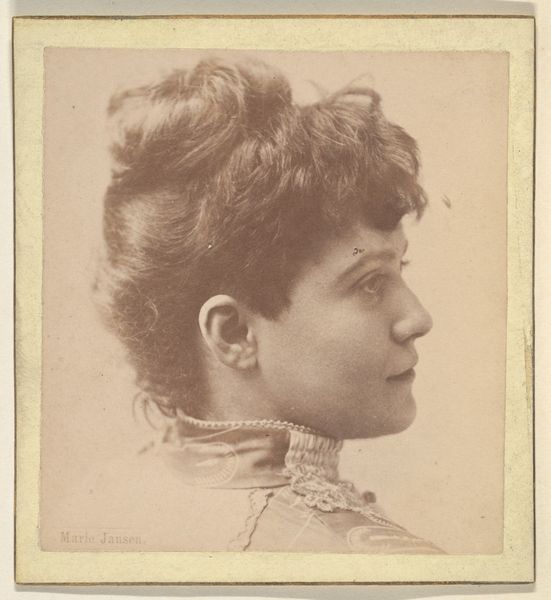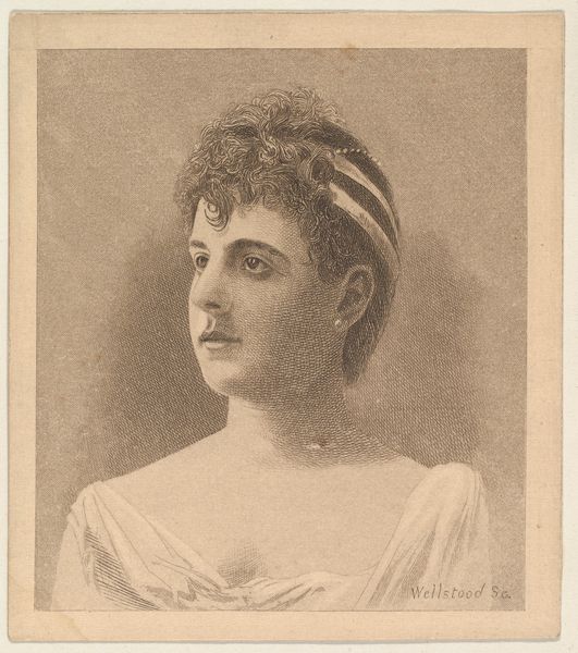 Editor: This portrait, made by Wm. S. Kimball & Co. in 1889 as part of their "Women's Portraits" series, is rendered in ink on paper. There's a delicate quality to the lines; it feels very commercial yet somehow also quite intimate. What strikes you most about this piece? Curator: Well, firstly, let's consider the nature of "Wm. S. Kimball & Co." – not artists in the traditional sense, but a tobacco company issuing collectible cards. It’s a prime example of how industry permeates culture. The image, produced using reproductive printing techniques, was clearly meant for mass consumption. We must then ask, what role does labor play? Editor: You mean the labour of the artist versus the production? Curator: Precisely! Whose hands guided the tools that made the printing plates? Consider the vast disparity between artistic skill and the ultimate purpose of the artwork – to sell cigarettes. This raises intriguing questions about value: Is this art or merely an advertisement? Editor: I see what you mean. So, it's not just about the face, but the entire economic system that produced this image. Curator: Exactly! The materiality speaks volumes. Ink, paper, and printing presses were readily available materials employed to manufacture desire and brand loyalty. We have to consider that this also represents a specific intersection of gender, consumption, and emerging mass culture. Editor: That's fascinating! I initially focused on the portrait itself, but now I understand that the real story is in the materials and the making of it. Curator: Indeed. Shifting the focus from the "artistic genius" to the means of production provides fresh and thought-provoking insights.