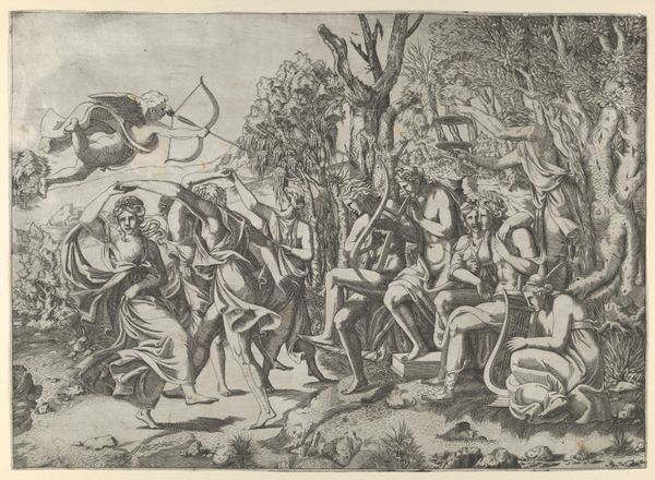 Curator: Looking at this print, "Cloelia Crossing the Tiber," made in 1608 by Niccolò Vicentino, the eye is immediately drawn to the turbulent waters. It sets a tone of urgency, doesn't it? Editor: Absolutely. I see a fascinating convergence of narratives centered on this act of crossing. There's an almost mythological quality evoked by the figure on horseback leading a group through this chaotic river. The cultural memory embedded in this scene seems quite potent. Curator: It depicts Cloelia, a Roman maiden held hostage by the Etruscan king Lars Porsena. She bravely escaped with other hostages, swimming across the Tiber to return to Rome. Editor: Yes, and that historical context is crucial. Her escape represents a powerful act of resistance, and a disruption of the patriarchal structures of her time. How often do we see women actively subverting political power in art of this period? It challenges normative representations. Curator: I agree, and Vicentino’s handling of light and shadow enhances the drama. Note how the figures emerging from the river on the far bank are illuminated, suggesting hope and safety after a harrowing journey. It highlights themes of liberty and female fortitude during the early Baroque. Editor: The river itself seems to function symbolically, though, representing not only a physical barrier, but also a transition, a transformative space where Cloelia defies her captivity, recasting ancient symbols in a subversive new context. I wonder how period viewers engaged with those signs. Curator: A compelling point. The landscape is also essential, anchoring her courageous act to a very specific space, underscoring that even within grand historical narratives, individual agency can dramatically alter collective destiny. And the landscape and use of linear perspective gives an early view into how narrative history would come to play out over time in painting. Editor: It's a vital reminder of how artists like Vicentino re-worked stories of female empowerment, adding depth and new interpretive levels to familiar iconic depictions that continue resonating across centuries. Curator: I think that this careful act of balancing art history and critical thinking reveals unexpected intersections of gender, power, and symbolism to shed light on artistic creations like this drawing. Editor: Absolutely. Delving deeper into historical accounts enables us to find a woman's journey, allowing it to bridge gaps between historical depictions and our present moment.