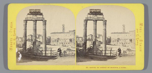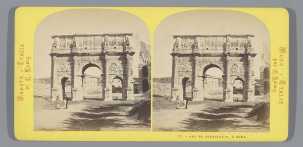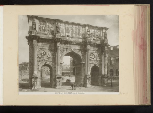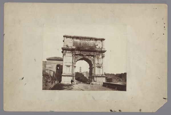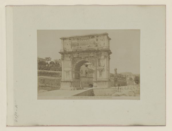 Editor: So, here we have Jean Andrieu's "Gezicht op de Boog van Titus," a collotype dating from somewhere between 1862 and 1876. There's a certain stillness to the image, despite it depicting this massive architectural monument. I'm curious, what historical context helps illuminate our understanding of it? Curator: Well, the proliferation of images like this one in the mid-19th century really speaks to the rise of tourism and a burgeoning visual culture. Consider that photography was still relatively new. What would it mean for the masses to suddenly have access to scenes from distant lands? Editor: So, it's about accessibility and dissemination? Like a postcard, almost? Curator: Precisely! Think about how images of Rome, with its layered history of imperial power and artistic achievement, served as potent cultural symbols. This photograph wasn't just documenting a ruin; it was actively constructing a particular narrative of European history. What do you think that narrative emphasized, given the political climate of the time? Editor: Perhaps the grandeur of the past, tying into contemporary ideas of nationhood and empire? I can see how these kinds of images would legitimize claims of power. Curator: Exactly. Andrieu’s work and others’ weren’t neutral records, they were involved in the circulation of specific ideologies. These were consciously shaped to influence how the public understood the present by presenting a certain version of the past. Editor: That’s fascinating. I never thought about how a simple photograph could be such an active participant in shaping cultural identity and political discourse. Curator: It’s a reminder that even seemingly objective records are embedded within power structures. What do you make of that in relation to today's media environment? Editor: I see how crucial it is to consider not just what we see, but why and how it's being shown to us.