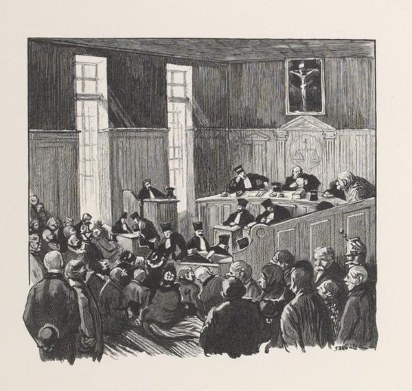 Curator: This lithograph, dating back to 1846, is by Honoré Daumier and is part of a series called "Les Gens De Justice," offering a sharp commentary on the French legal system. Editor: My initial reaction is a feeling of claustrophobia and cynicism. The scratchy lines, the way the figures are crammed together, the heavy ink... it speaks of corruption and discomfort. Curator: Daumier was a master of social critique, wasn't he? You see that masterful use of lithography – think about the physical labor of creating those tonal gradations with greasy crayon on stone. That's not just about aesthetics; it’s about mass production, about making this critique widely available. Editor: Absolutely. This print becomes a powerful vehicle for challenging institutional authority, particularly the justice system, and reflects the romantic sensibility pervasive during that period. Look at the inscription underneath – the world is delighted, except for the accused! What a damning statement on the priorities of the court. Curator: Right. It is important to remember the process: this wasn't a singular artwork for a wealthy patron; this was designed for mass consumption in journals. He is directly addressing and attempting to influence public opinion and shape social awareness on matters of jurisprudence. Editor: And it's done with such masterful caricature! The puffed-up faces of the lawyers, the drooping despair of the accused… He exposes the theatricality of the courtroom, the performances of power that disregard individual lives. Even the cheap paper stock, its very materiality, speaks to the everyday nature of this injustice. Curator: Precisely! Considering this piece and his others, what are we really consuming when we purchase something like this and consider the cultural contexts? How have perceptions of justice changed? And if so, have they truly improved? Editor: This image still resonates so strongly. It makes you wonder, how much has really changed since 1846? Are we still susceptible to the same theatrical displays and corrupt practices within our legal institutions? It really does provoke questions of public perception versus individual experience.