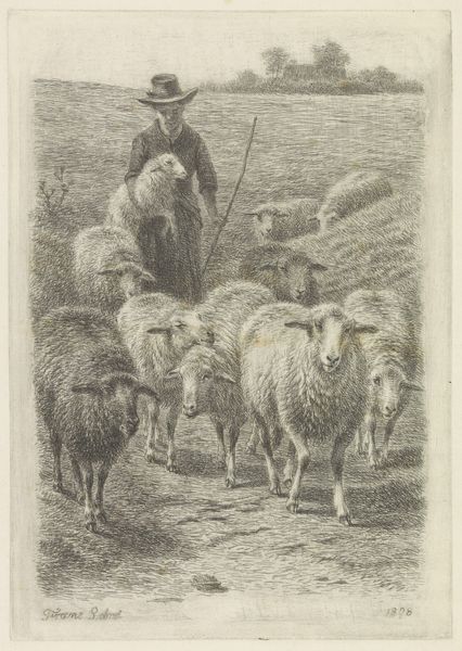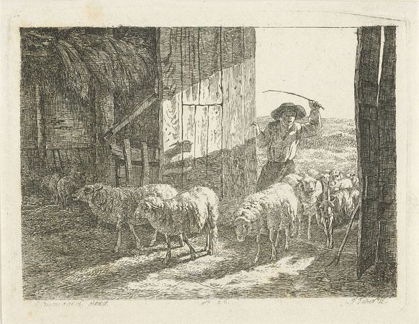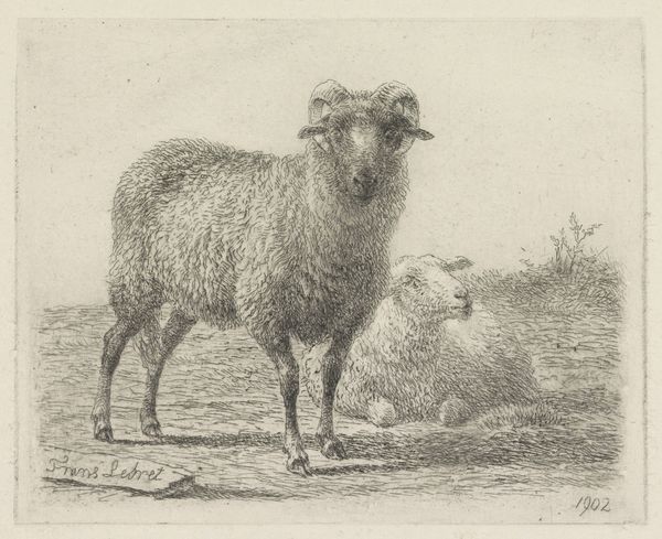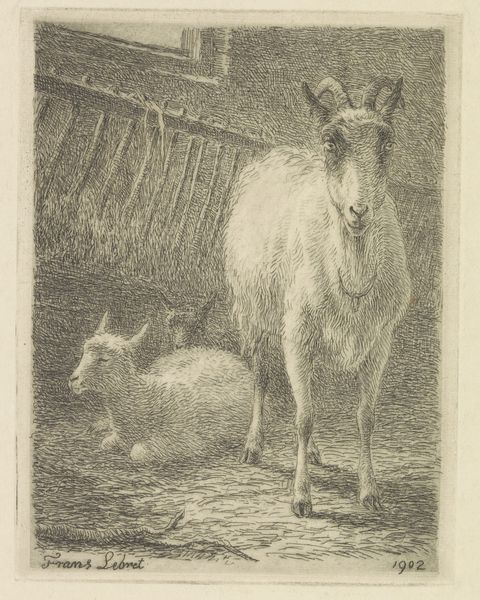 Curator: Looking at this intimate scene, I’m reminded of a quote from John Berger, "The sheep is Mother Earth's great soft answer." This is "Schaap zoogt lam in een stal," an etching by Frans Lebret from 1901. Editor: Oh, I adore this! There’s such tenderness in the simple lines. It feels incredibly grounded, like stepping into a quiet moment of rural life. Curator: The Realist movement championed scenes from everyday life. Pieces like this reflect the artistic interests of that time, but also spoke to broader societal concerns around the turn of the century regarding rural decline and the romanticization of simpler ways of living. Editor: Right! And there’s a definite idealized quality, isn't there? Like a memory softened by time. But even though there's that rose-tinted sheen, it also feels deeply honest somehow, capturing that pure, unadulterated bond between a mother and her child—or, you know, ewe and lamb. Curator: Motherhood, yes, often served as an easily digestible symbol, a way to normalize social ideals and values. Lebret uses line etching to bring us very close to this nurturing moment. What do you see in the animal's expressions? Editor: The mother has this calm watchfulness, like she's taking in everything and missing nothing, that maternal sense of awareness, while the other sheep… there’s just blissful oblivion! Total surrender to the moment, warmth, and nourishment. It’s enviable. Curator: Consider how images like this would circulate, becoming affordable additions to middle-class homes, gently shaping views of nature and the family. In many ways, genre painting has continued to normalize very specific cultural values. Editor: Exactly. While simultaneously providing access to fleeting instants we crave… Like that sheep is saying, "Hang on a sec, the good stuff is right here." A lovely and deeply sentimental rendering, skillfully achieved in such a minimalist, pared-down etching style. Curator: Sentimentality aside, thank you for allowing me a fresh peek into the social undercurrents that made this work what it became. Editor: My pleasure! Thanks for reminding me not to let beauty distract me from what an image like this is truly doing in the world.