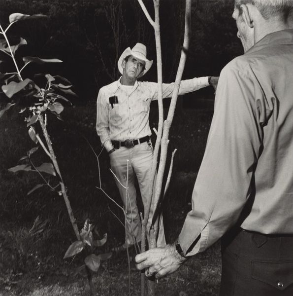 Curator: Looking at Milton Rogovin's photograph, "Appalachia," created in 1981 using the gelatin silver print method, I immediately get a sense of stark resilience. What about you? Editor: The overwhelming presence of natural and constructed objects speaks to resourcefulness born out of economic need, of making do. You see how densely packed it is—materials dominate every inch of space around this man. Curator: The man himself stands framed by the doorway, a silent guardian against a backdrop of obvious, but easily missed, signs of struggle, as evidenced by his humble clothing, or the state of the shack around him. What might you infer from his expression? Editor: The crossed arms, coupled with his gaze, suggests a complex internal world, pride perhaps, tinged with the resignation found too often among laborers whose work is devalued by the markets. Consider the labor that made everything we see: the construction, the garden—it's the material manifestation of a life. Curator: That reading seems especially relevant when you consider that Rogovin dedicated so much of his life to documenting working-class families, particularly those marginalized by society. The garden isn't just a garden. It is survival. Editor: Precisely. These recurring images create almost a visual language over time. We see how this echoes broader themes within American identity, linking notions of self-sufficiency to hard labor. Note, for example, how nature thrives within confinement of industrial discards. The light bulb is present within his porch and growing things cover the broken fencing on his lawn. Curator: The contrast between the verdant overgrowth and the decay is compelling, and that lightbulb inside the doorway as you noted also lends itself to deeper meaning. I also think, though, there is no easy read of any life: it seems that the symbolism can give us clues but the truth is likely unknowable. Editor: In the end, it invites reflection on how objects and environments reflect, reinforce, and ultimately shape who we become. It allows us to see working-class Americans with the respect they are so rarely given. Curator: Indeed, a powerful commentary on value and resilience. It does much to restore their pride, doesn’t it?