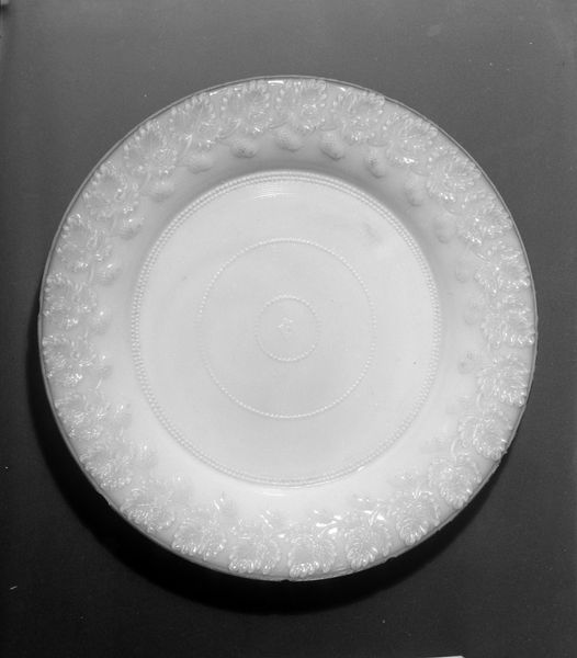 This delicate plate was created by the New England Glass Company sometime between 1818 and 1888. Notice its circular form, a shape that immediately suggests wholeness and continuity. The plate is rendered in a soft, milky glass, its surface adorned with subtly raised patterns. These repeating motifs, reminiscent of shells and floral bursts, are distributed around the rim, creating a rhythmic visual texture. The choice of a monochromatic palette underscores the emphasis on form and texture over color. The interplay of light and shadow across the raised patterns gives the plate a tactile quality, inviting a closer inspection. Consider the implications of this design. The circular shape and the decorative elements create a sense of containment and order, suggesting a world in miniature. The plate, as a functional object, transcends its utilitarian purpose, becoming a canvas for exploring ideas about structure, symmetry, and the subtle beauty of repeated forms. The New England Glass Company asks us to consider the aesthetic potential of everyday objects.